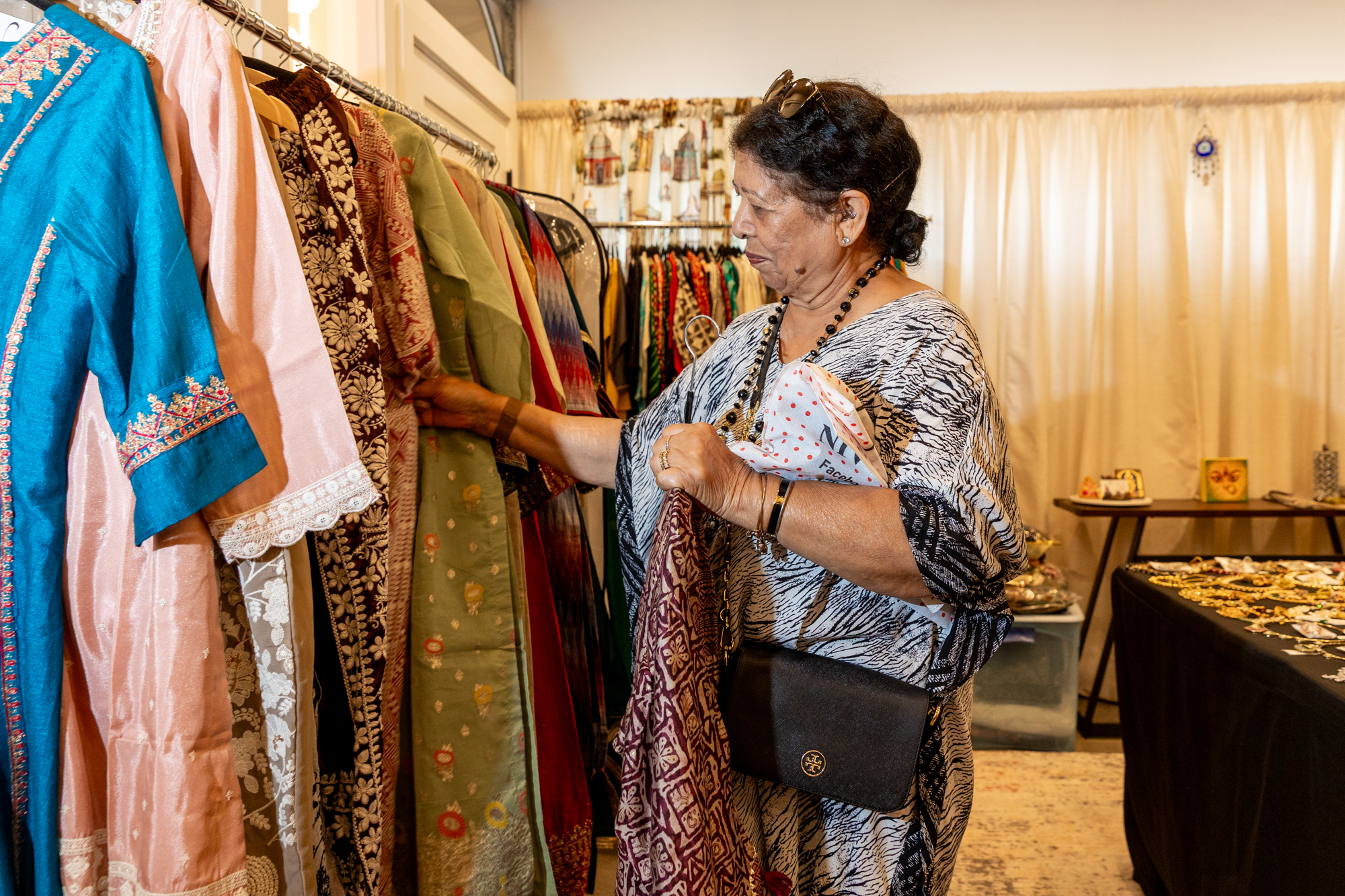 Harbans Chabra shops at Nivy’s Nook, a home-based business run by Nimisha Jadav, in Morgan Hill on September 13, 2025. (Tâm Vũ/KQED)