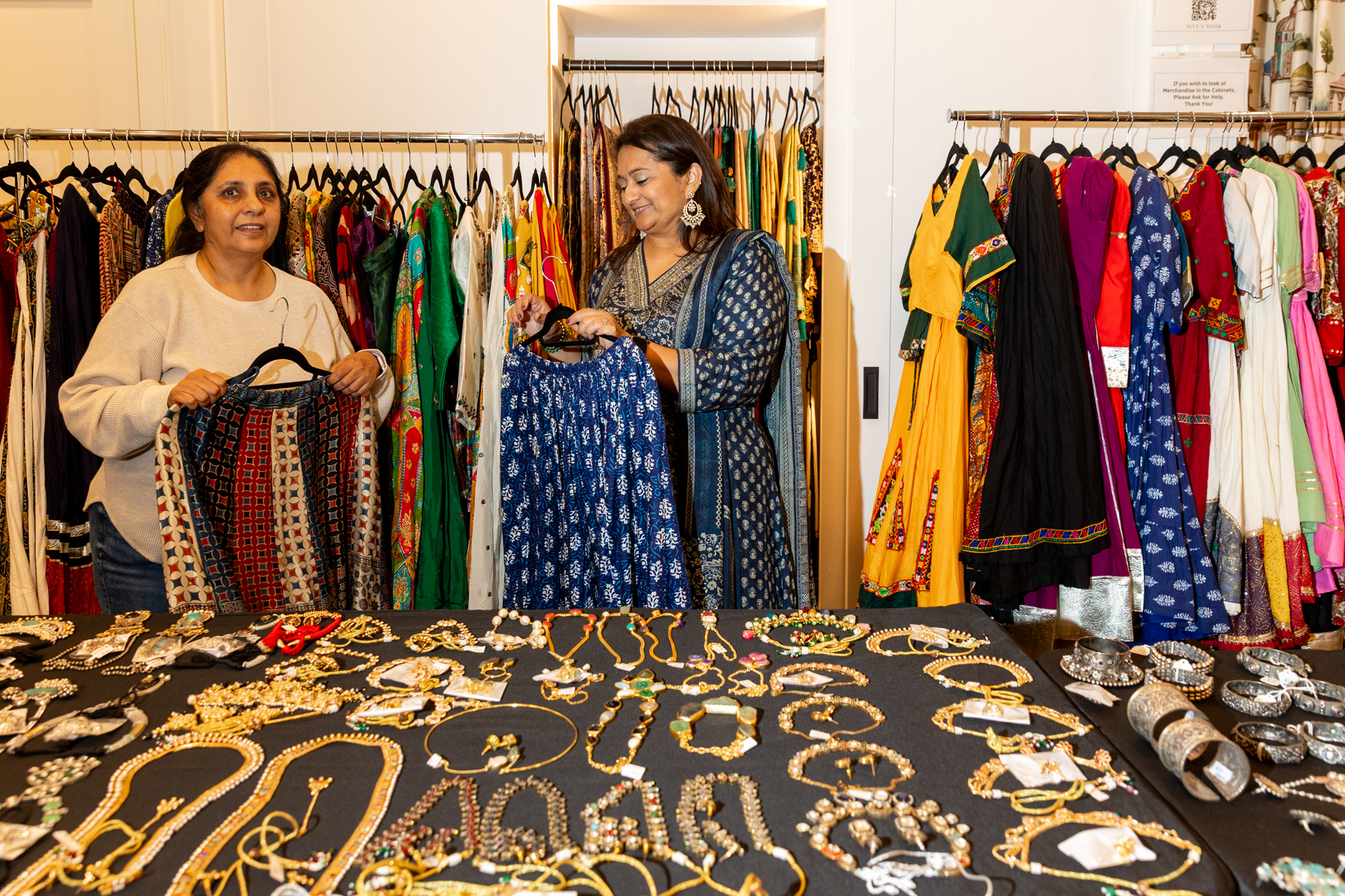 Alpa Nagarsheth (left) shops with the help of Nimisha Jadav (right) at Jadav’s home-based clothing business, Nivy’s Nook, in Morgan Hill on September 13, 2025. (Tâm Vũ/KQED)
