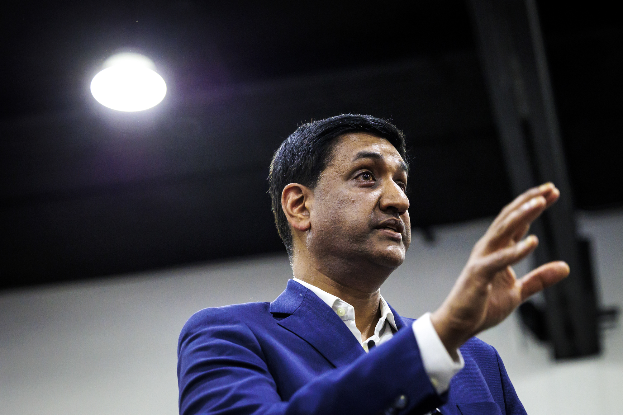 Rep. Ro Khanna holds a town hall meeting at the MLK Community Center in Bakersfield on March 23, 2025, the first of three town hall events Khanna was set to have in Republican-held congressional districts across the state. (Martin do Nascimento/KQED)
