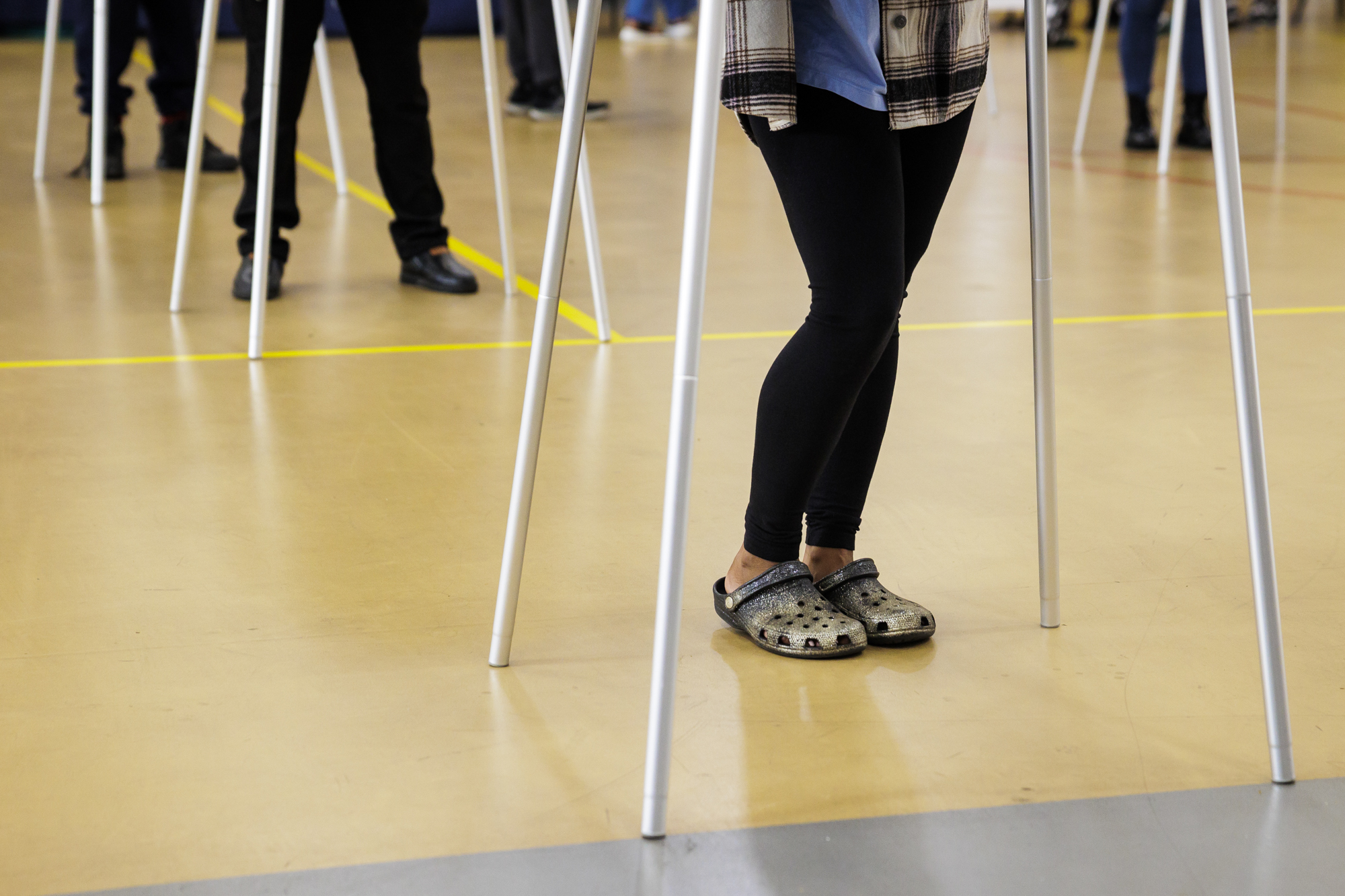 Voters fill out their ballots at Allen Temple Baptist Church in Oakland on Nov. 5, 2024. (Martin do Nascimento/KQED)