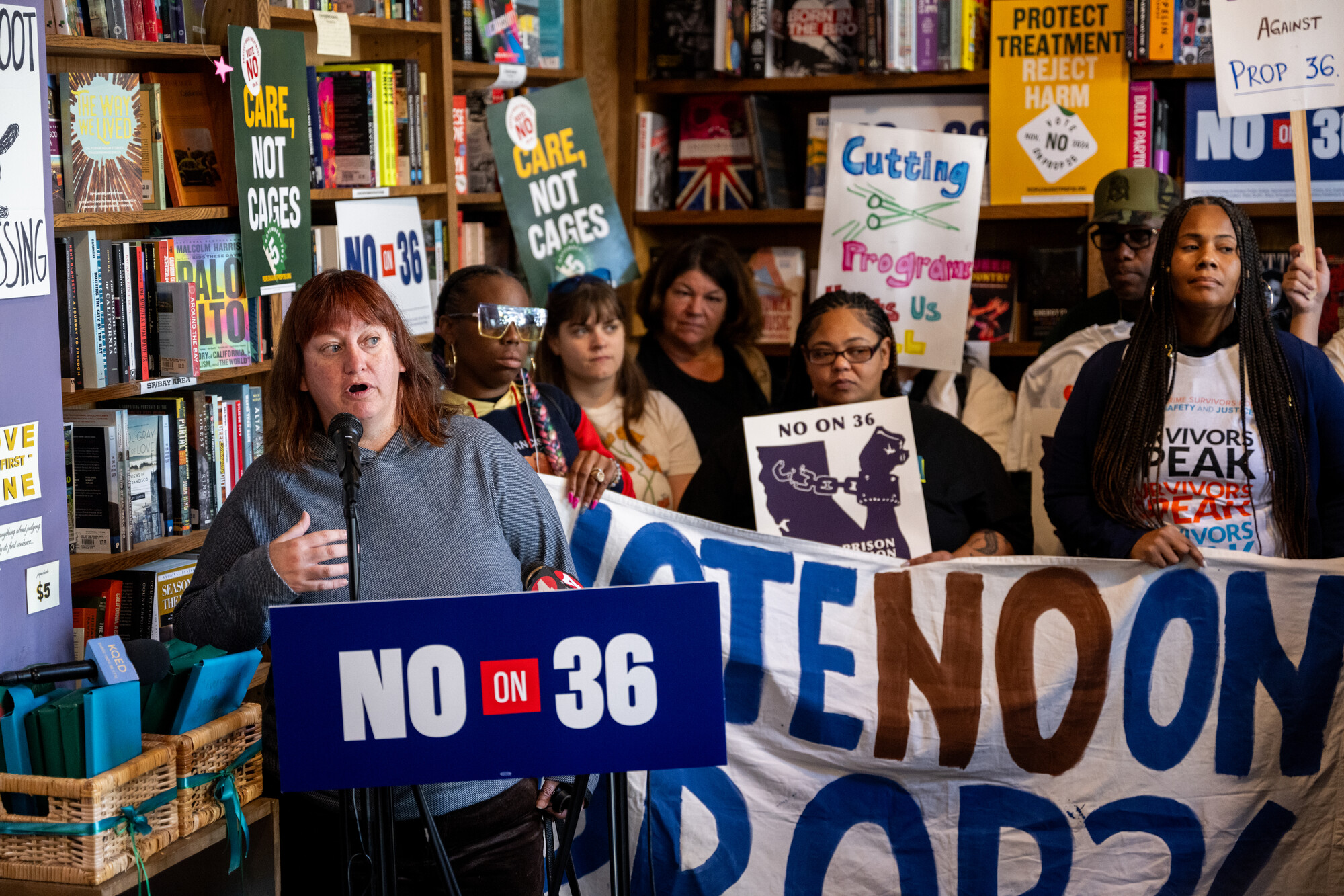 Booksmith owner Christin Evans speaks during a rally against Proposition 36 at the Upper Haight bookstore, Booksmith, in San Francisco on Oct. 22, 2024. (Beth LaBerge/KQED)