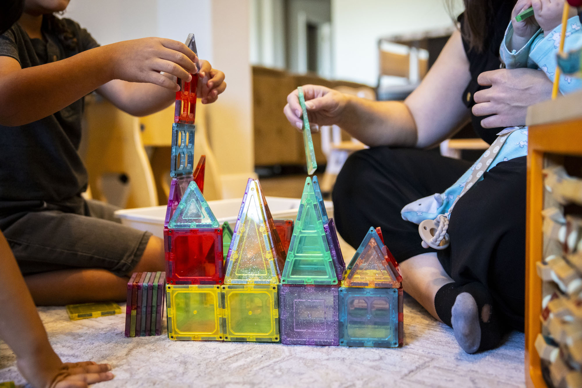 Mariam Younathan plays with the children attending the day care at her home in Manteca on Oct. 8, 2025. (Martin do Nascimento/KQED)