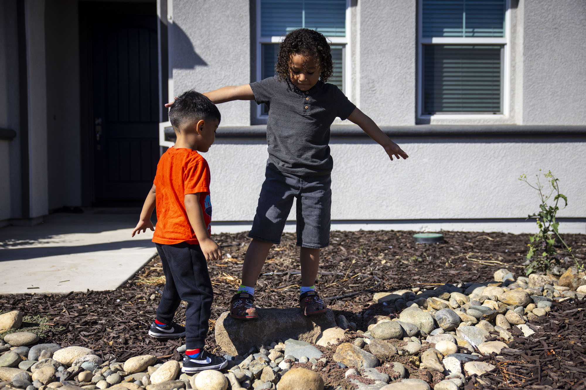 Ezariah (left) and Jaxson play together at Mariam Younathan’s day care at her home in Manteca on Oct. 8, 2025. (Martin do Nascimento/KQED)