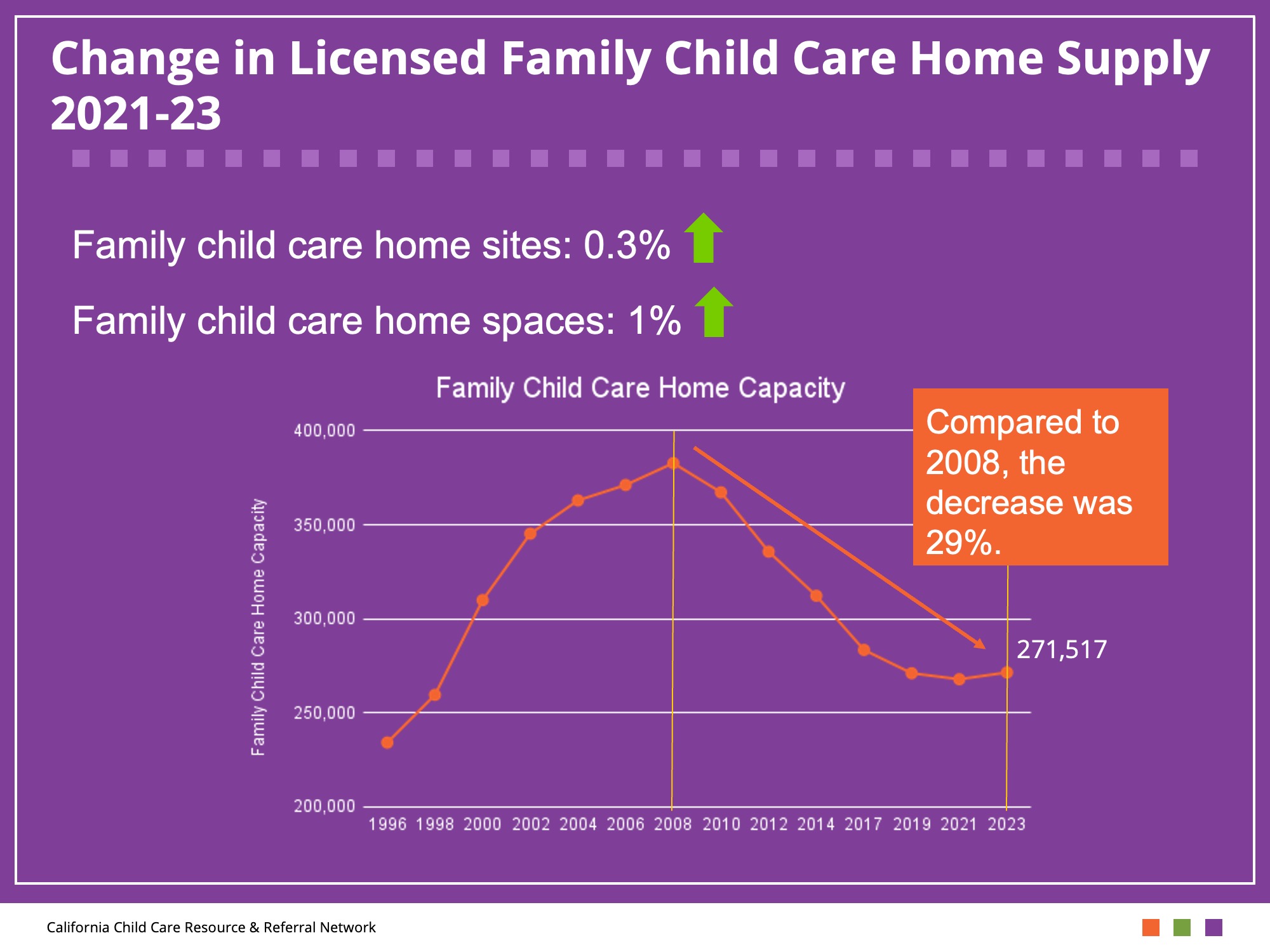 Since the housing market collapse in 2008, California has lost nearly 30% of licensed family child care homes, according to state data analyzed by the California Child Care Resource & Referral Network. The state is far from rebuilding this type of child care option for families. Between 2021 and 2023, the number of family child care homes increased by 0.3%. (Courtesy of California Child Care Resource & Referral Network)