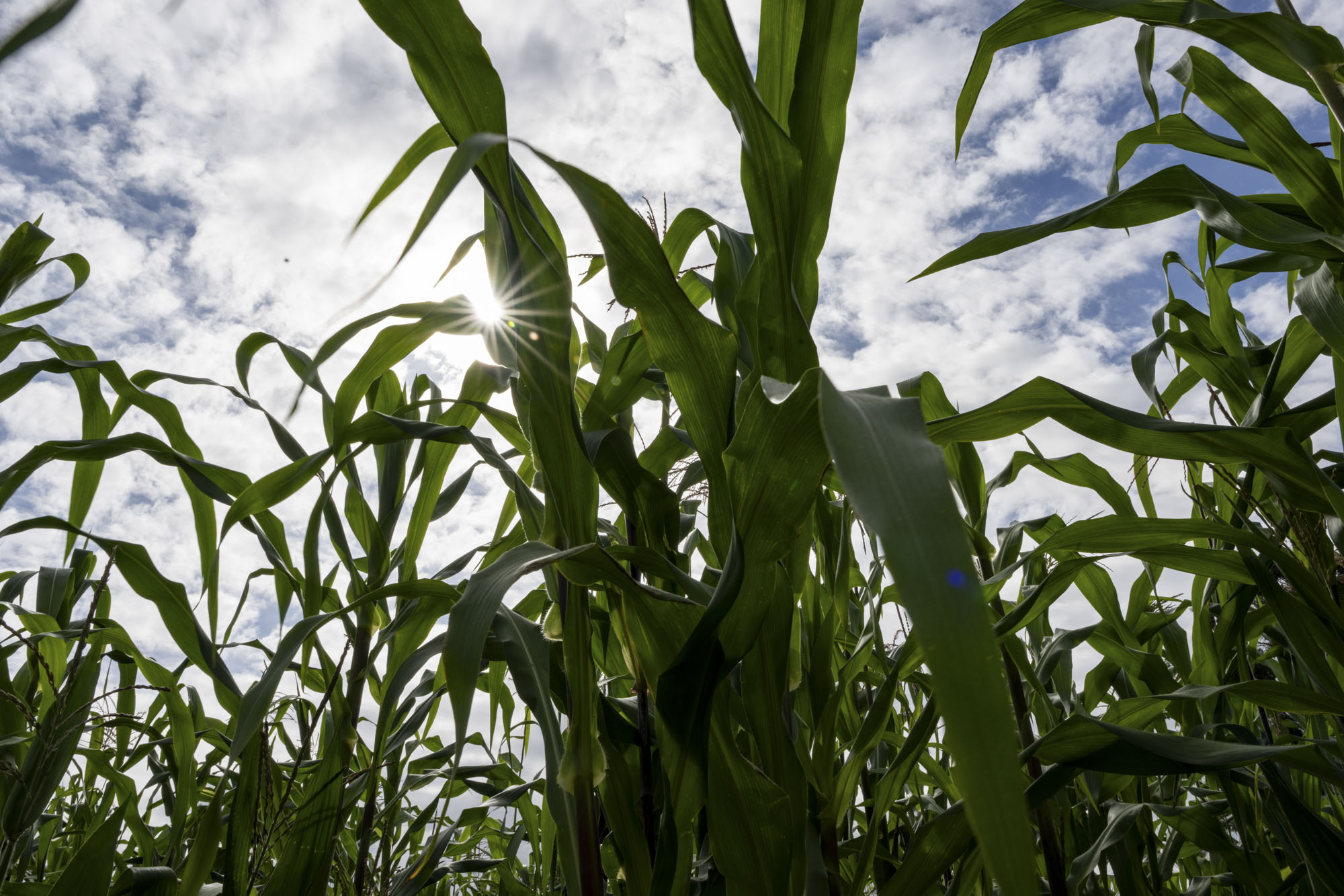 Sun shines through the leaves of a corn stalk in the corn maze at Andreotti Family Farms in Half Moon Bay on Oct. 9, 2025. (Beth LaBerge/KQED)