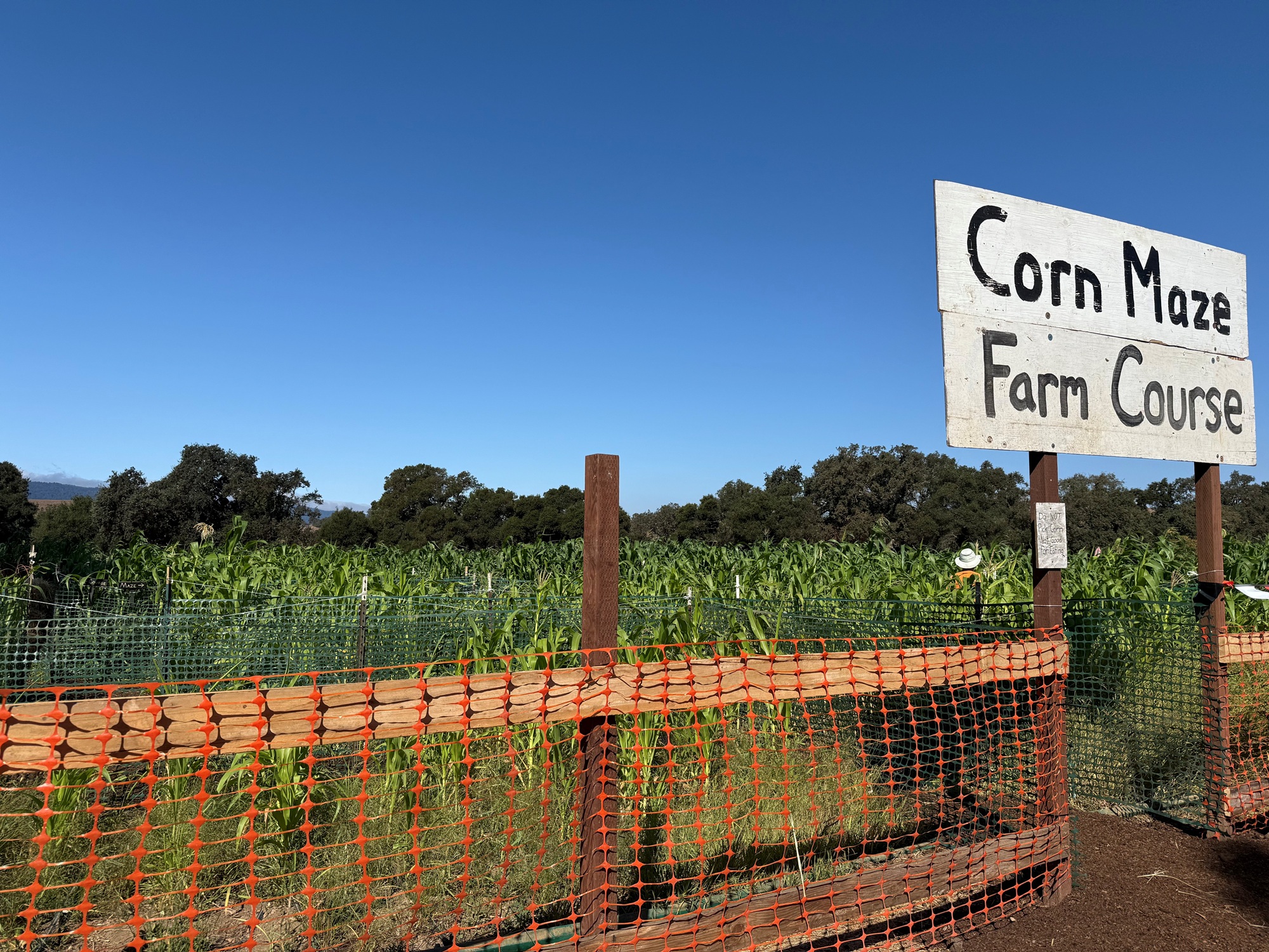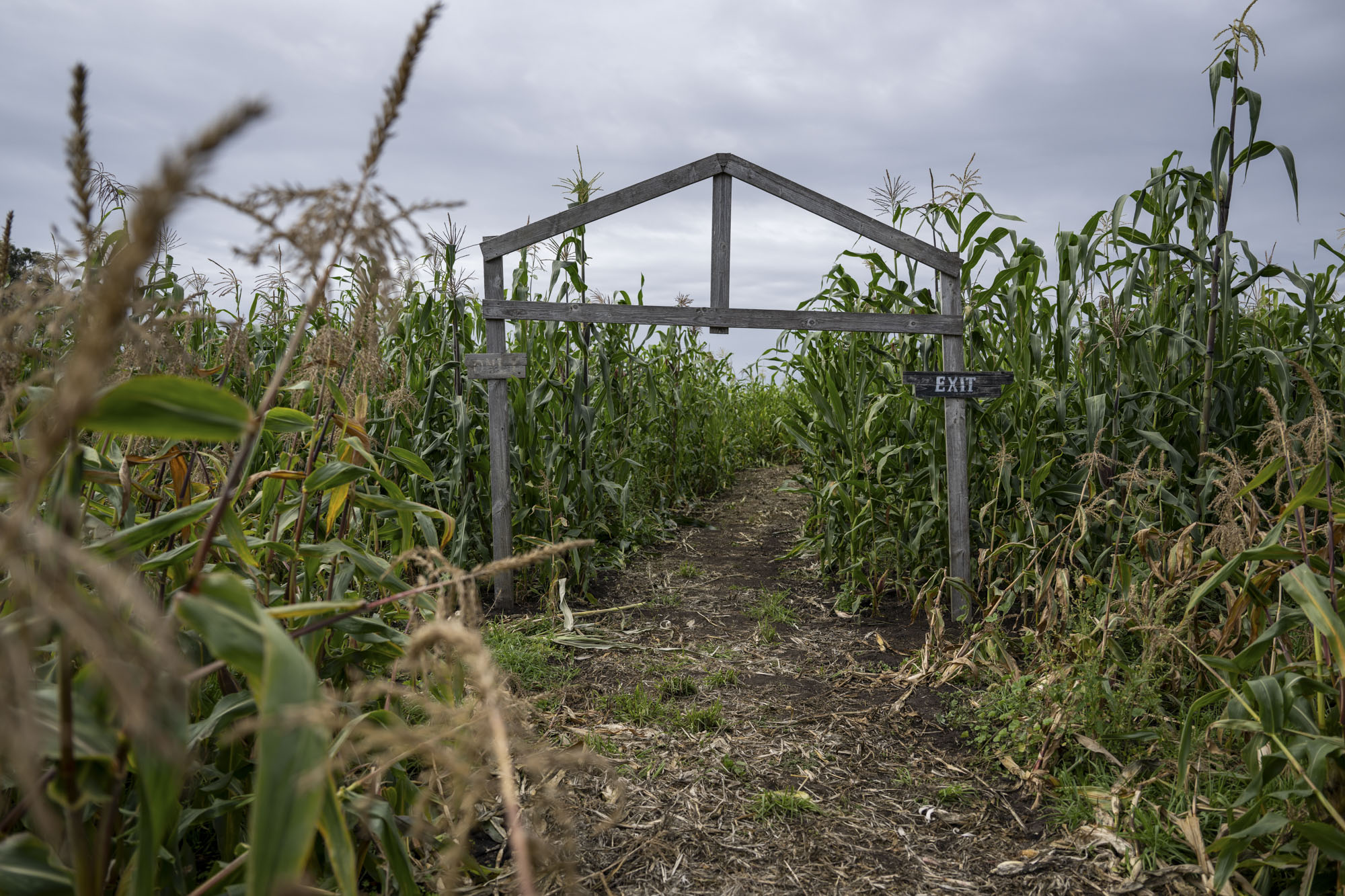 The exit of the corn maze at Andreotti Family Farms in Half Moon Bay on Oct. 9, 2025. (Beth LaBerge/KQED)