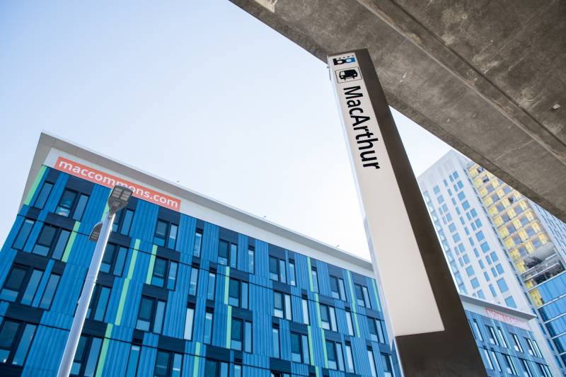 Apartment buildings under construction near Macarthur BART station in Oakland, on Feb. 21, 2020. SB 79 from San Francisco state Sen. Scott Wiener builds on years of advocacy to add more housing stock in California’s biggest metro areas, overriding local zoning laws. (Beth LaBerge/KQED)