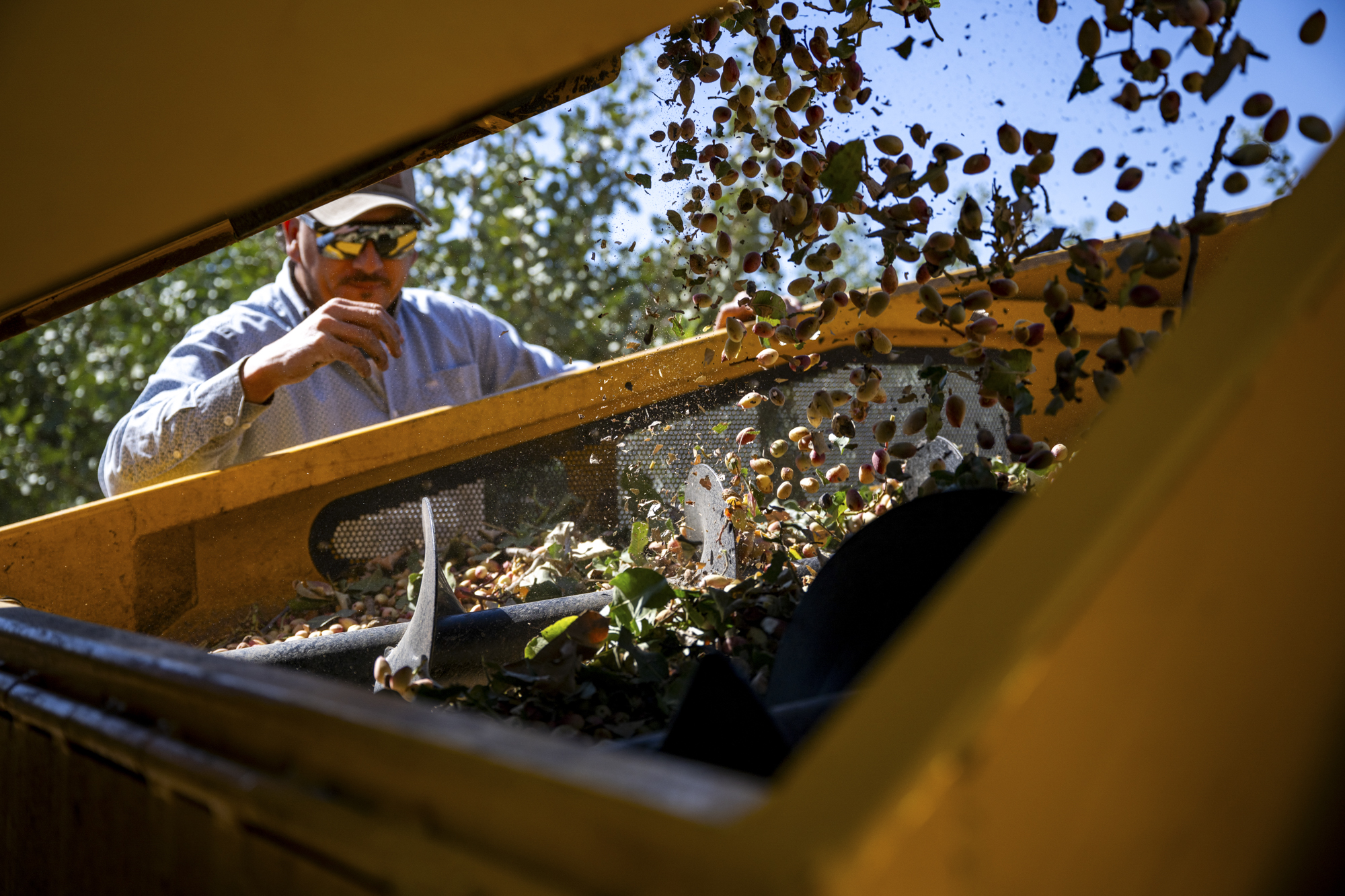 Standing in this orchard, the long-tailed machine — known as a tree shaker — feels like it’s conjuring earthquakes with each jolt. Ripe pistachios rain down into large containers and within hours, the tree shaker can collect up to 3,000 pounds of nuts.