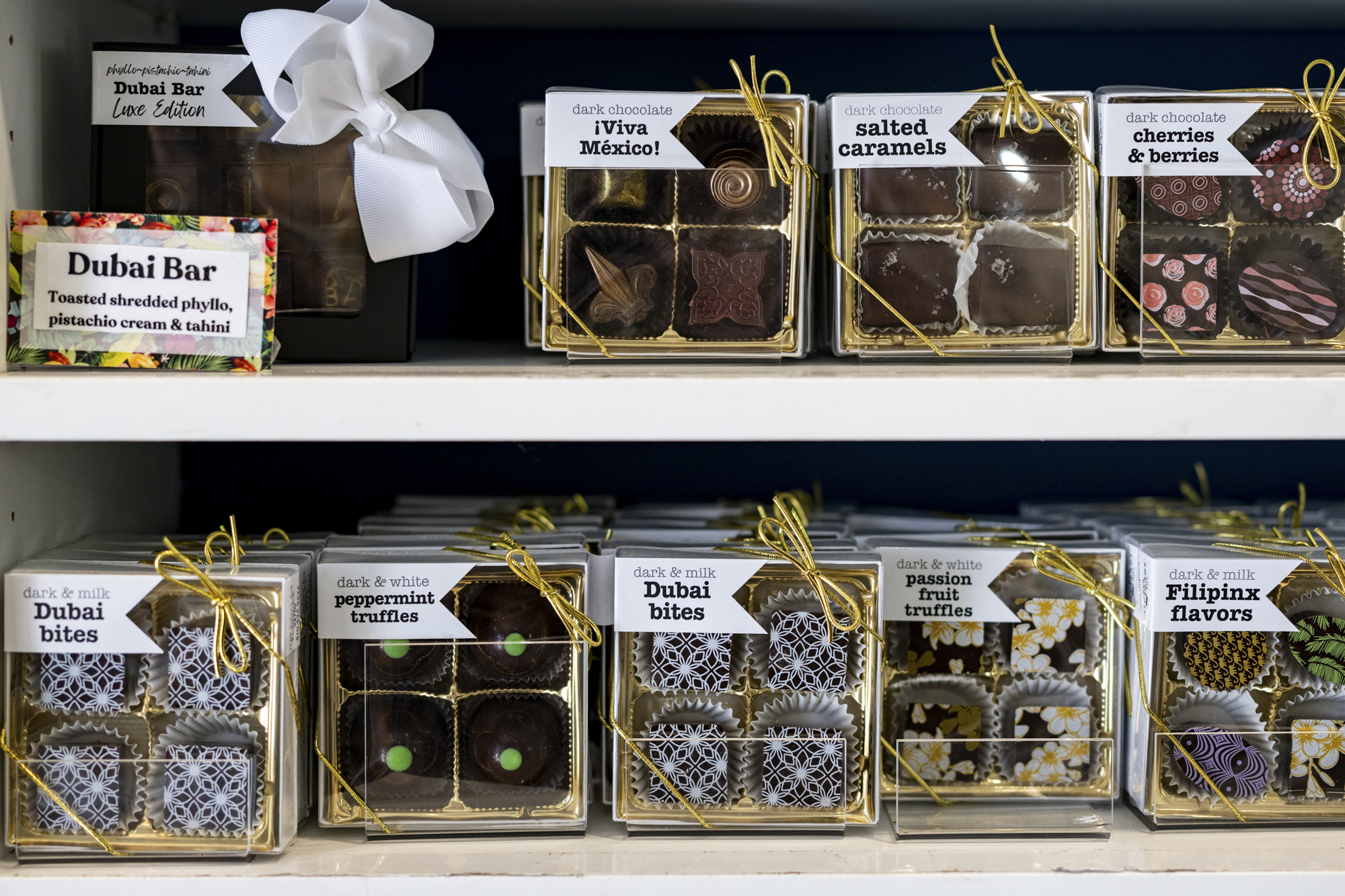 Boxes of Dubai chocolates sit on the shelf at The Xocolate Bar in Berkeley on Oct. 16, 2025. (Beth LaBerge/KQED)
