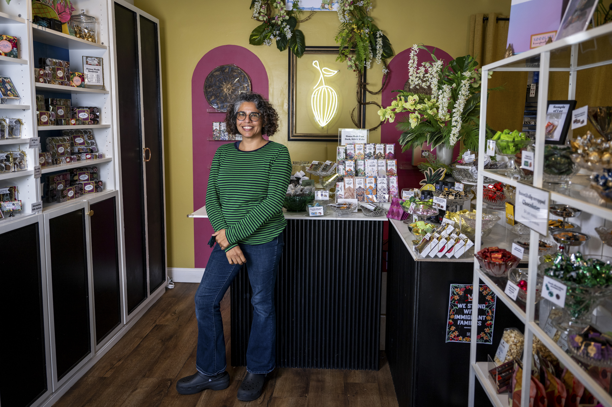 Malena Lopez-Maggi, owner and chocolatier, at The Xocolate Bar in Berkeley on Oct. 16, 2025. She co-founded the chocolate business in 2006 and is known for crafting artisanal, plant-based chocolates. (Beth LaBerge/KQED)