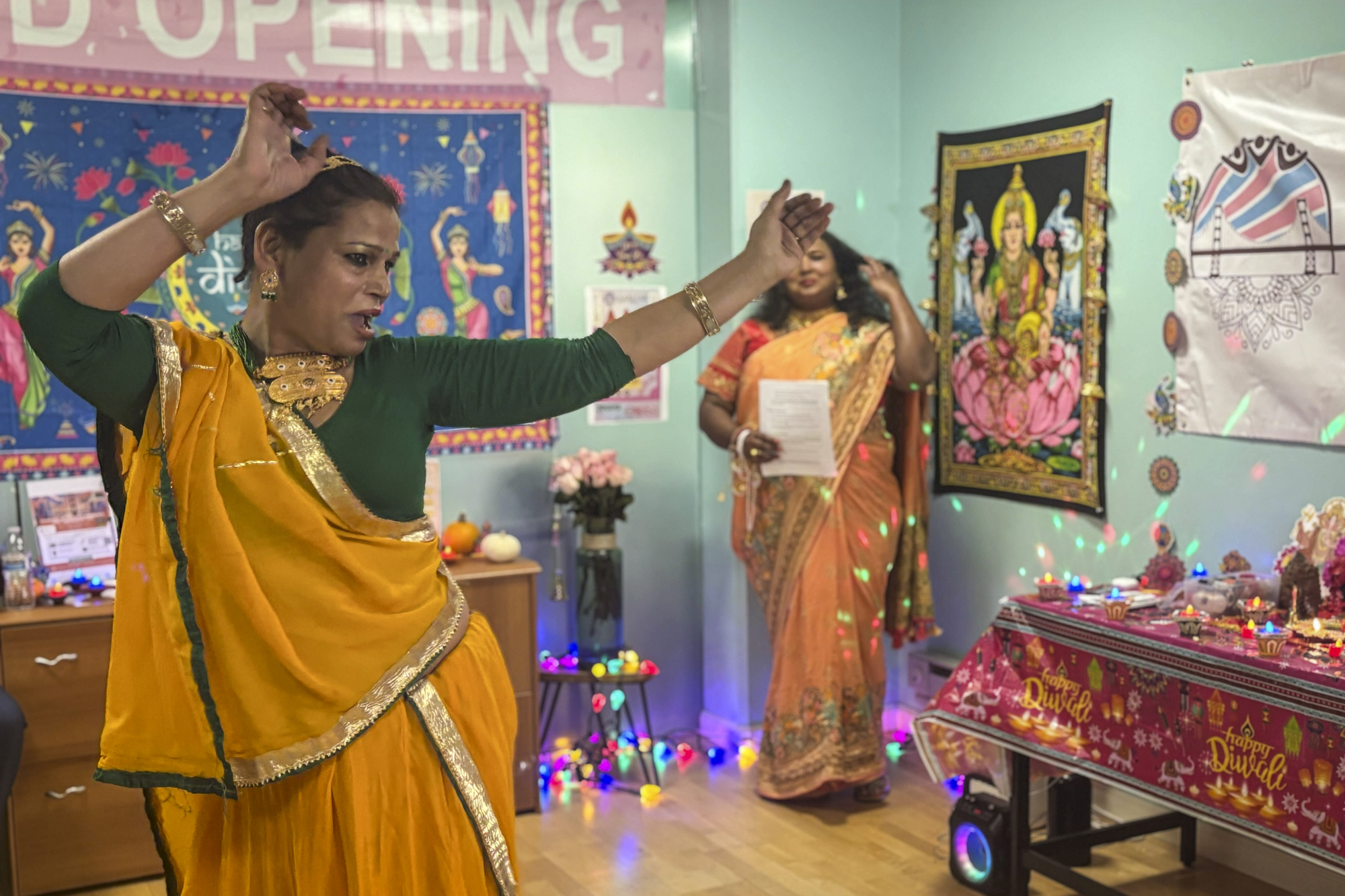 Kaj (left) dances during the Diwali celebrations at Parivar Bay Area in San Francisco on Oct. 20, 2025. Parivar Bay Area, a new transgender-led organization supporting gender-diverse immigrants, opened its doors in downtown San Francisco during Diwali. (Nisa Khan/KQED)