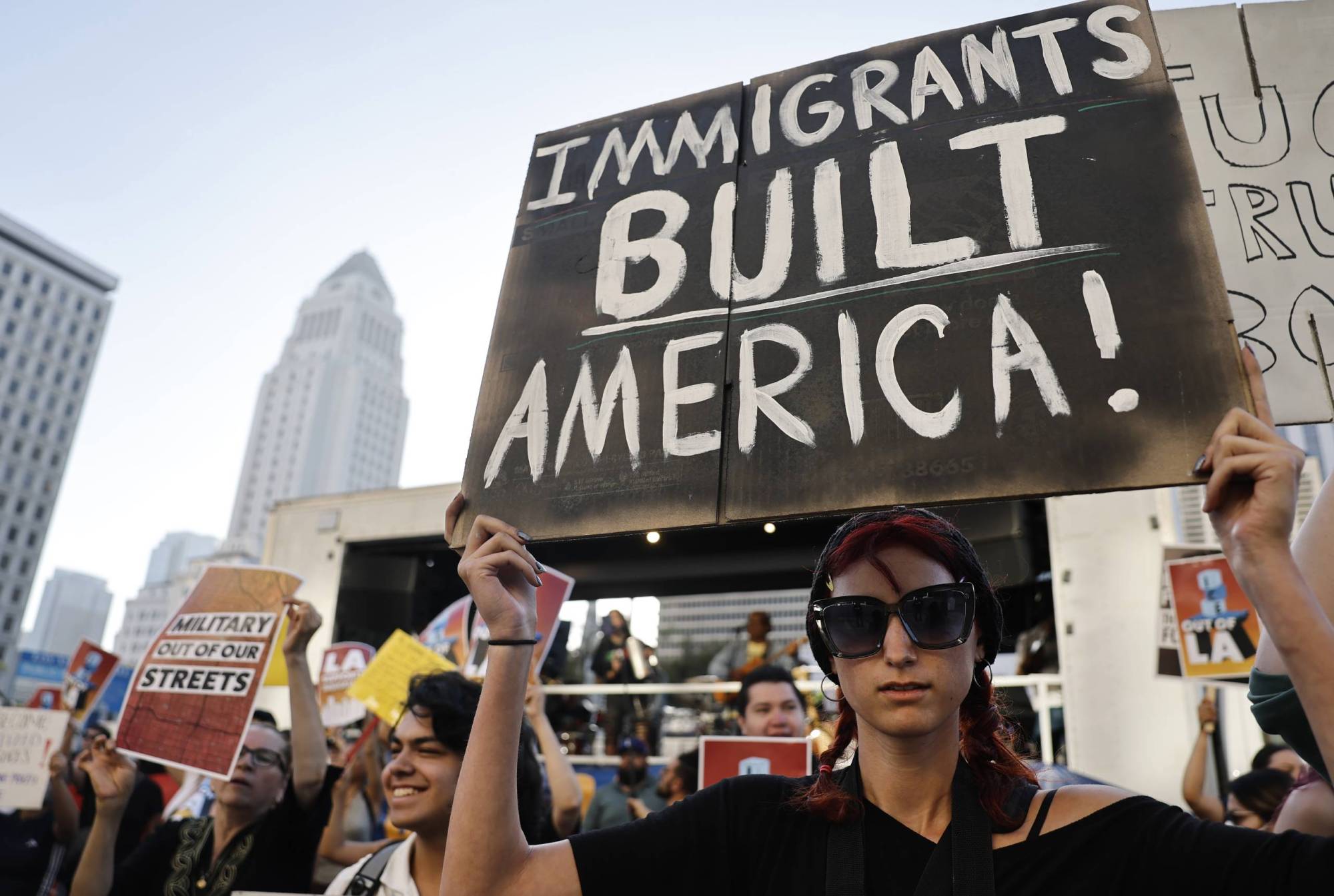 A protester carries a sign reading “Immigrants Built America!” as anti-ICE demonstrators protest outside a federal building on June 19, 2025, in Los Angeles, California. (Mario Tama/Getty Images)