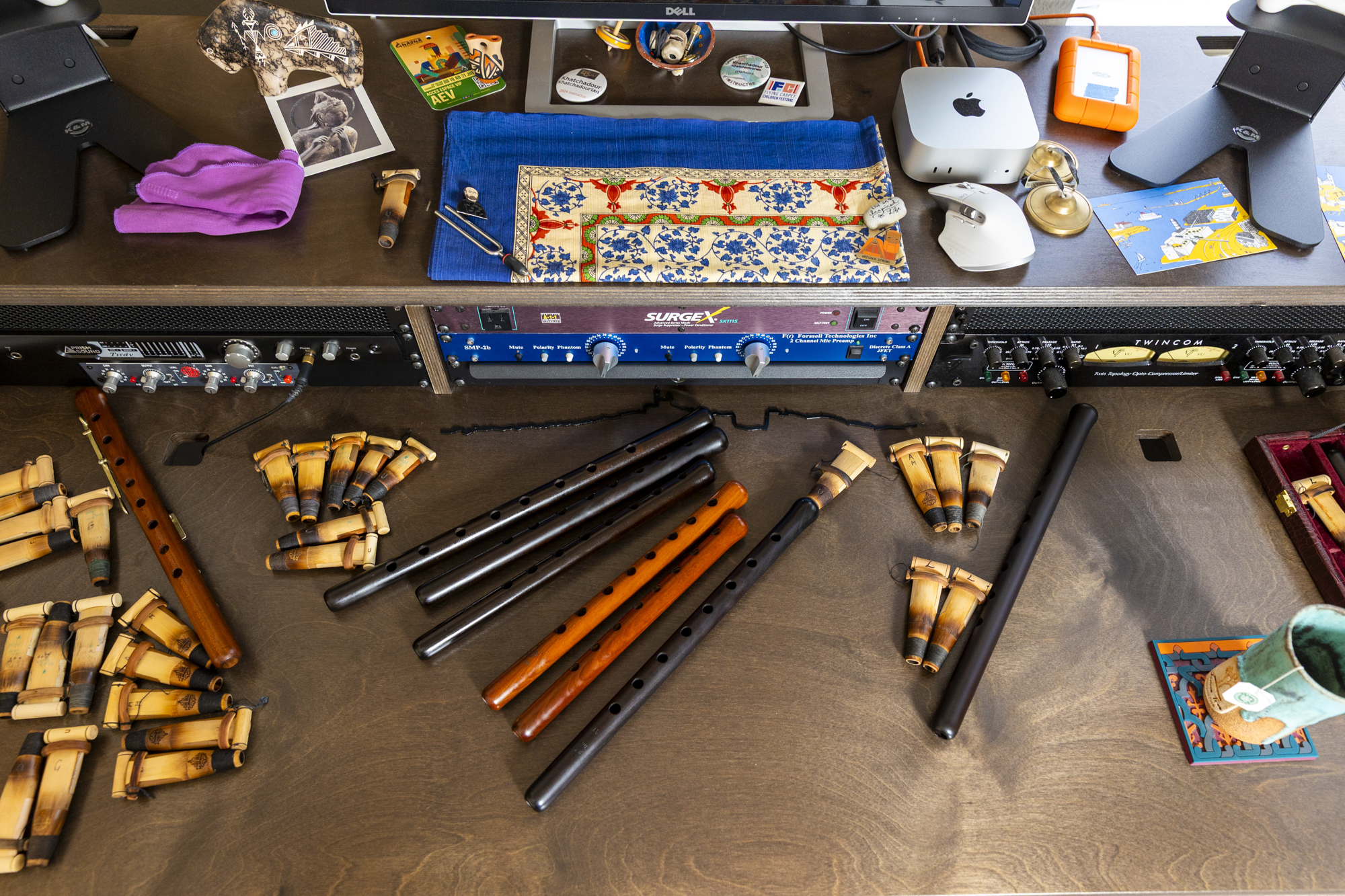 Khatchadour Khatchadourian’s duduk collection rests on a desk in his home studio in Santa Rosa on Oct. 22, 2025. (Tâm Vũ/KQED)
