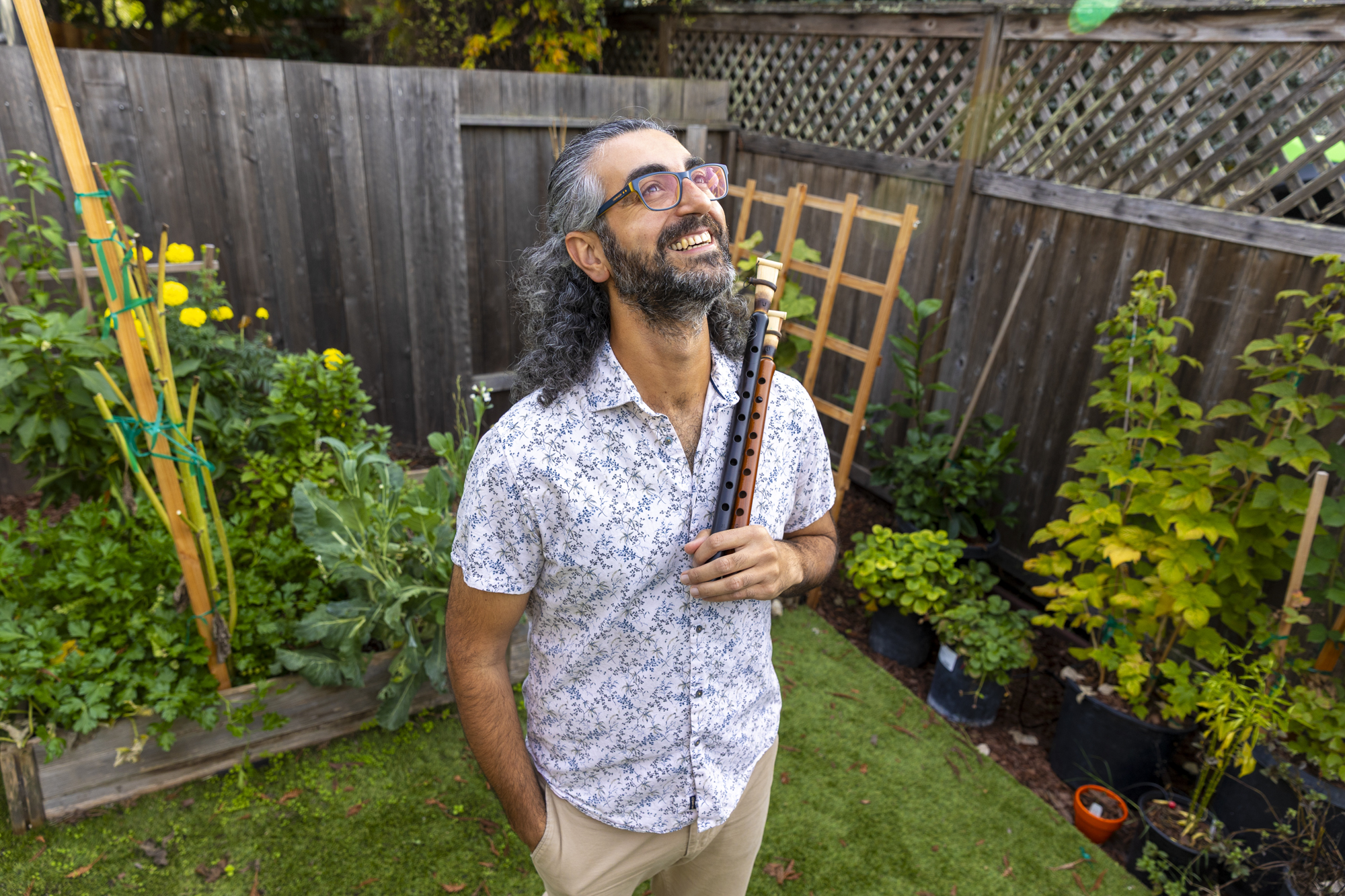 Khatchadourian poses for a portrait with his duduk in his backyard in Santa Rosa on Oct. 22, 2025. The Bay Area musician's soulful voice and breath bring the ancient Armenian duduk to life, blending grief and beauty in every note.