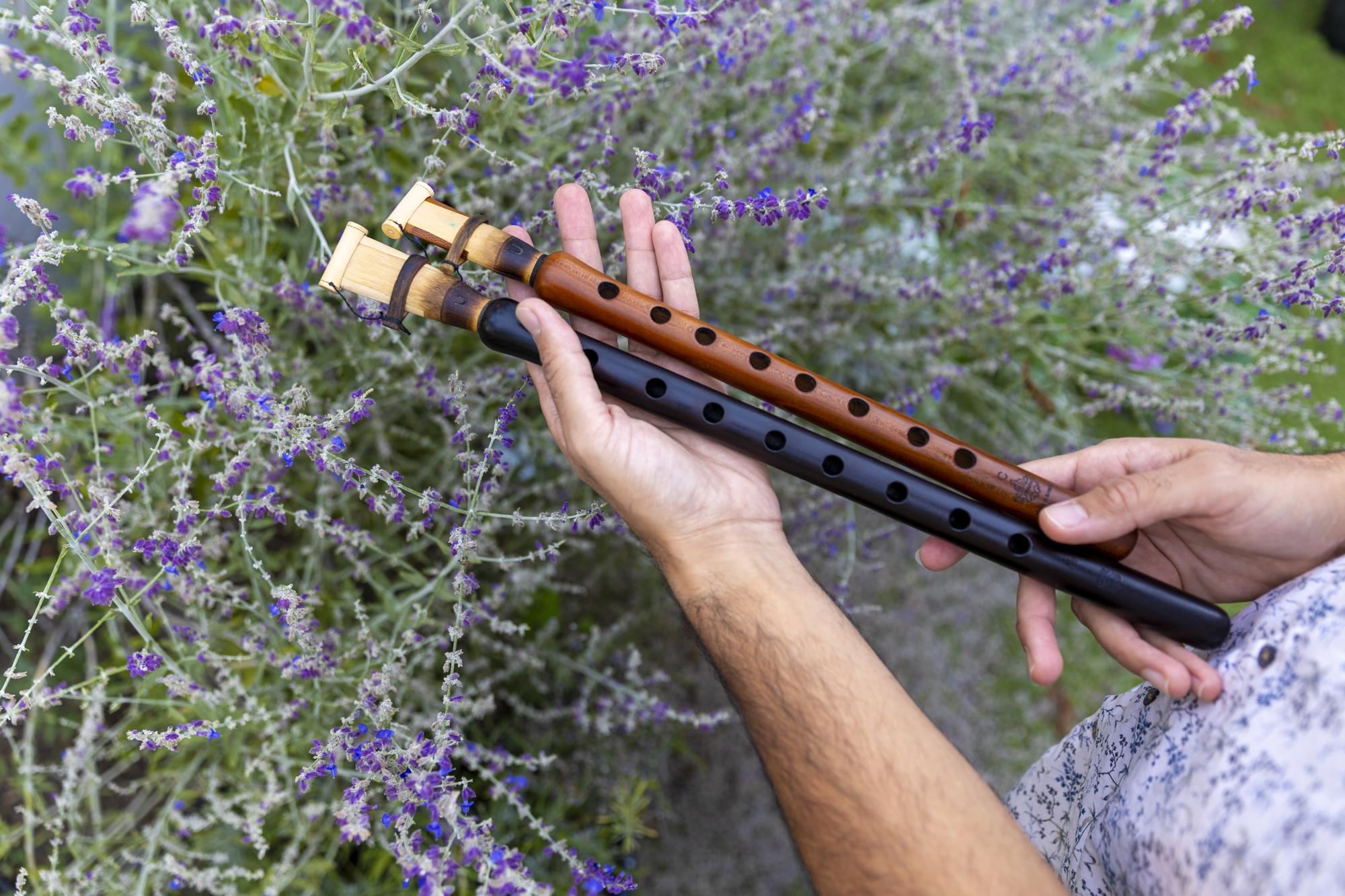 Khatchadourian displays two of his duduks, Armenian folk instruments, in his backyard in Santa Rosa on Oct. 22, 2025. (Tâm Vũ/KQED)