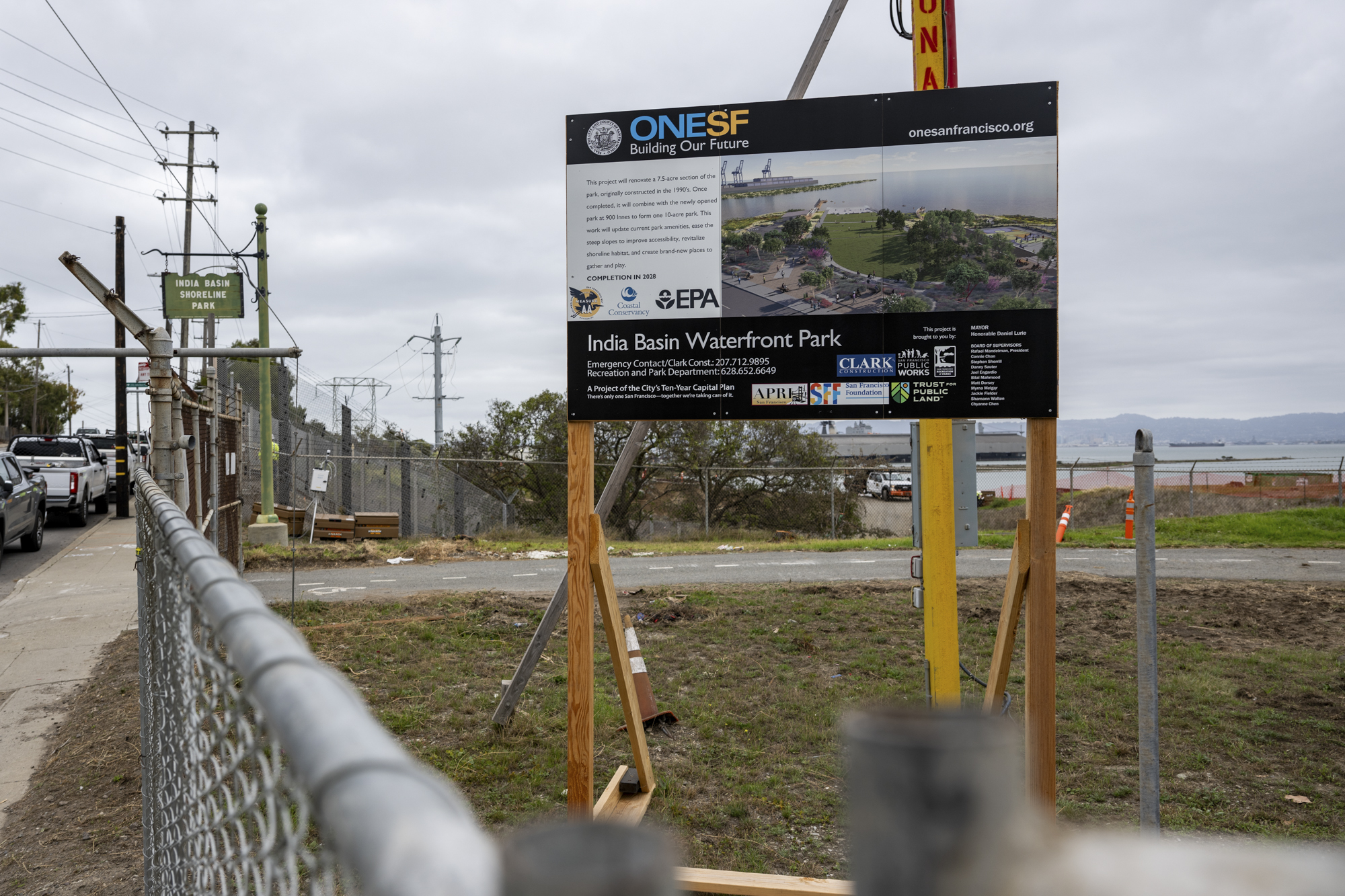 A sign announces upgrades to the India Basin Shoreline Park in San Francisco on Oct. 22, 2025. (Beth LaBerge/KQED)