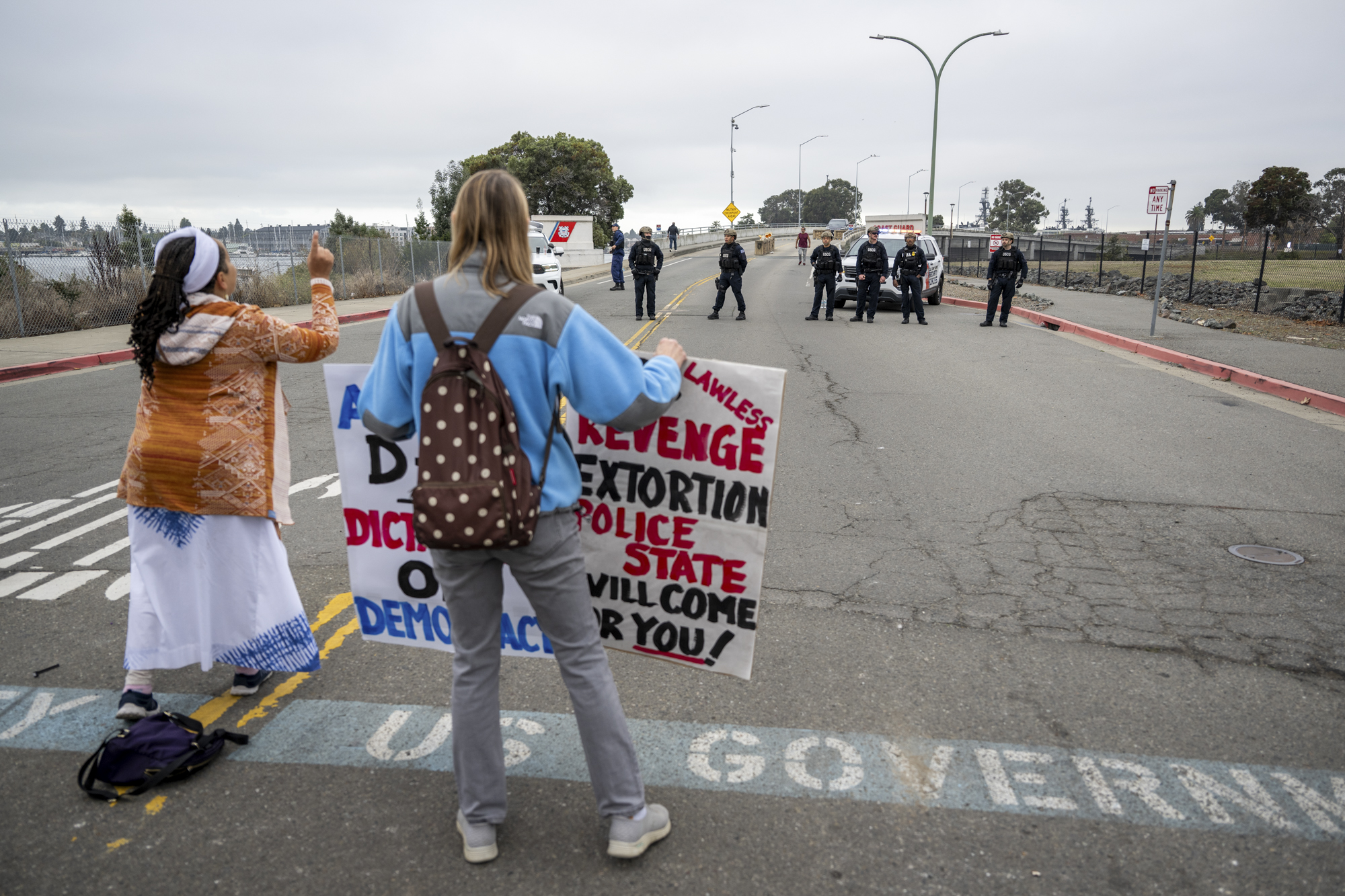 Demonstrators gather in front of the entrance to a U.S. Coast Guard base in Oakland on Oct. 23, 2025. (Beth LaBerge/KQED)
