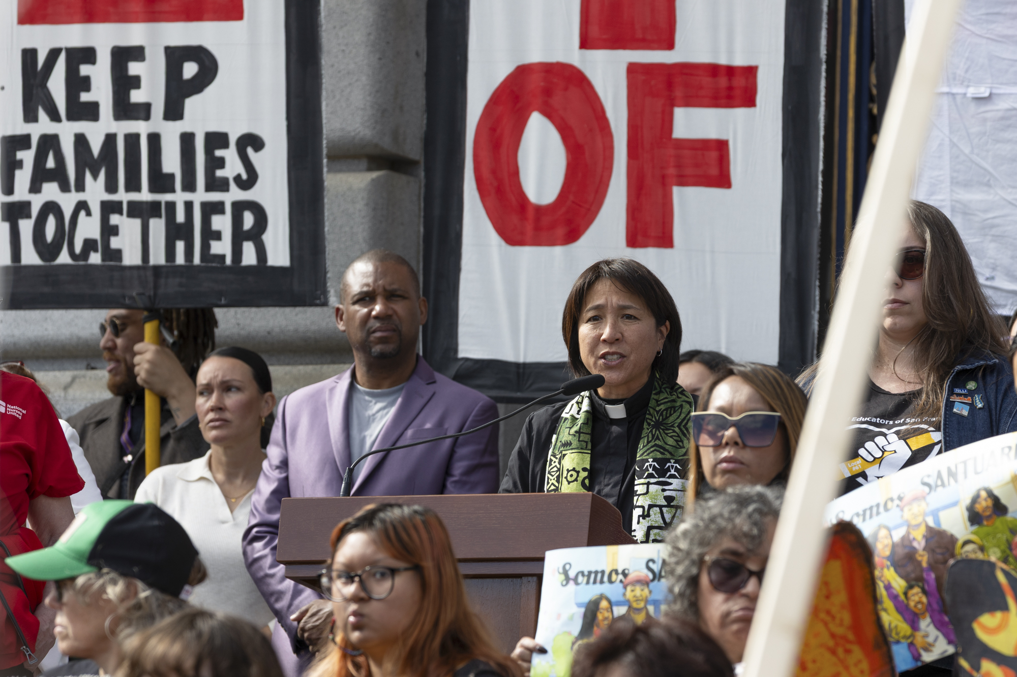 Rev. Deborah Lee, co-executive director of the Interfaith Movement for Human Integrity, addresses the crowd on Oct. 23, 2025 rally at San Francisco City Hall. (Gustavo Hernandez/KQED)