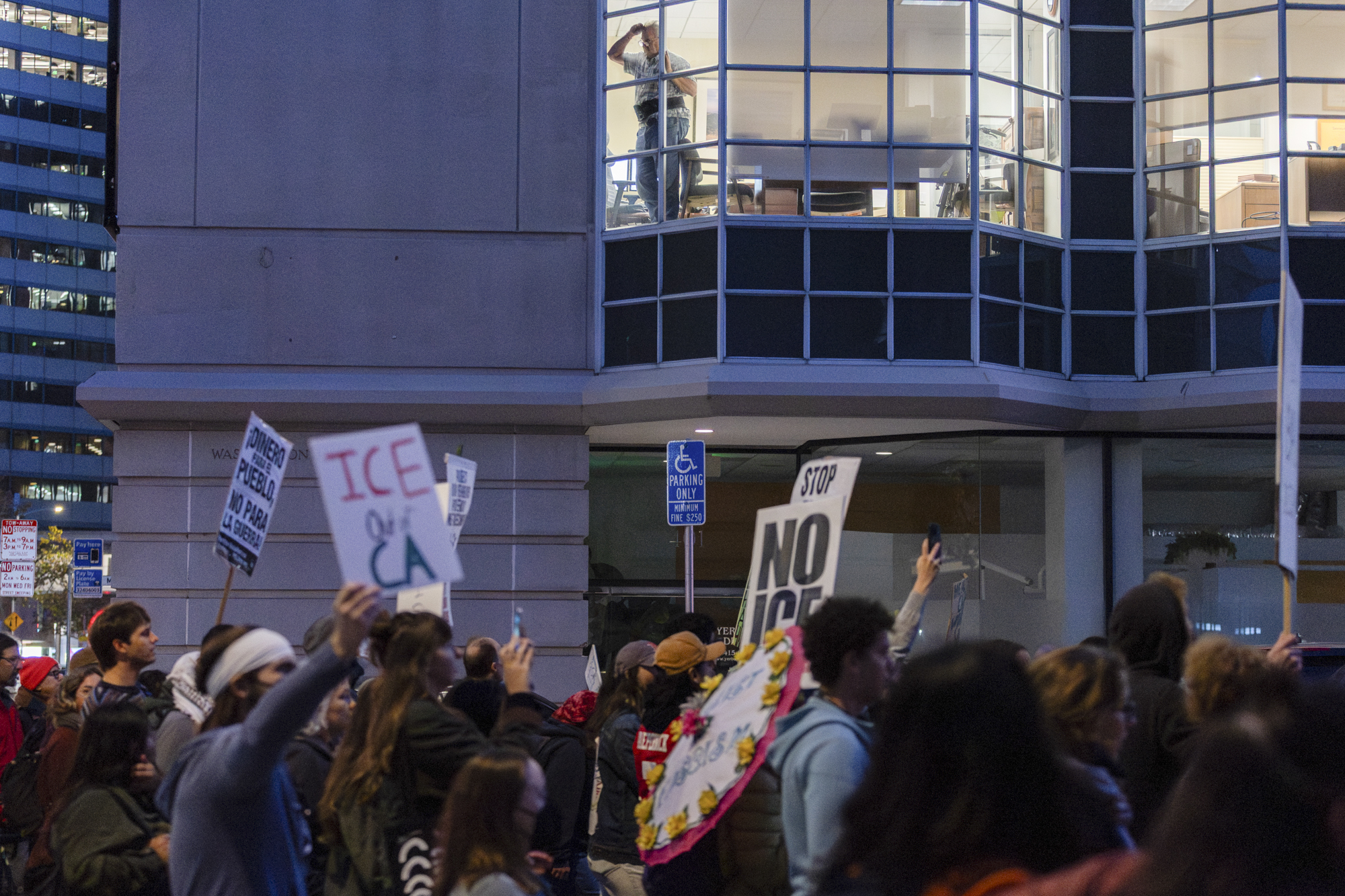 A man watches from an office window as protesters pass by during the Bay Resistance march in San Francisco on Oct. 23, 2025. (Gustavo Hernandez/KQED)