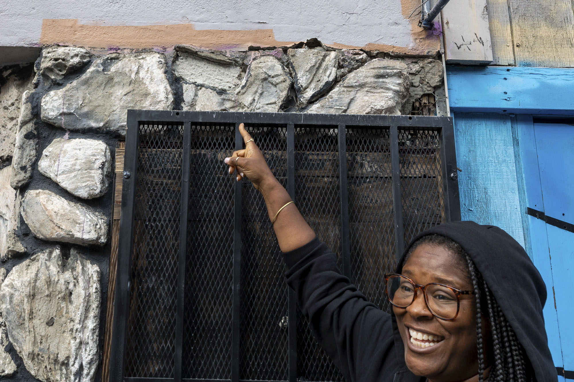 Noni Session points to the spot where the first brick was removed from Esther’s Orbit Room during renovations on Seventh Street in Oakland on Oct. 2, 2025. The cooperative is seeking skilled masons to help preserve its original stone facade. (Gustavo Hernandez/KQED)