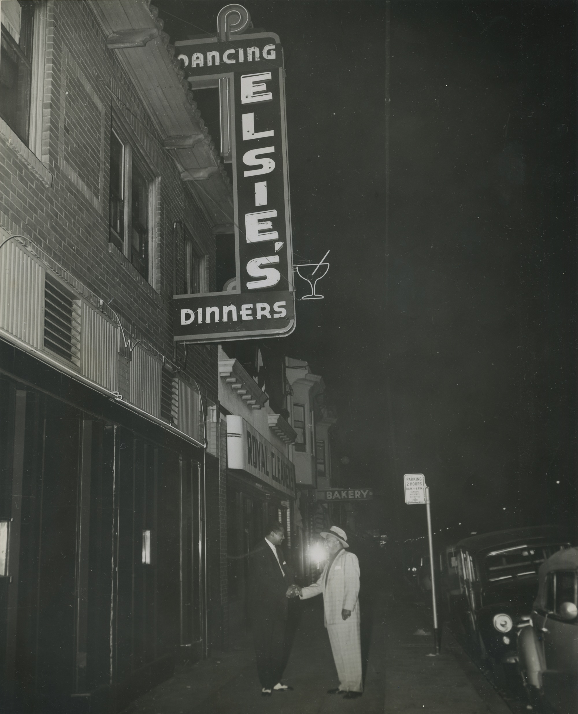 Two men stand shaking hands on the sidewalk underneath Elsie’s neon sign on Seventh Street, circa the 1950s. (Courtesy of the African American Museum & Library at Oakland)