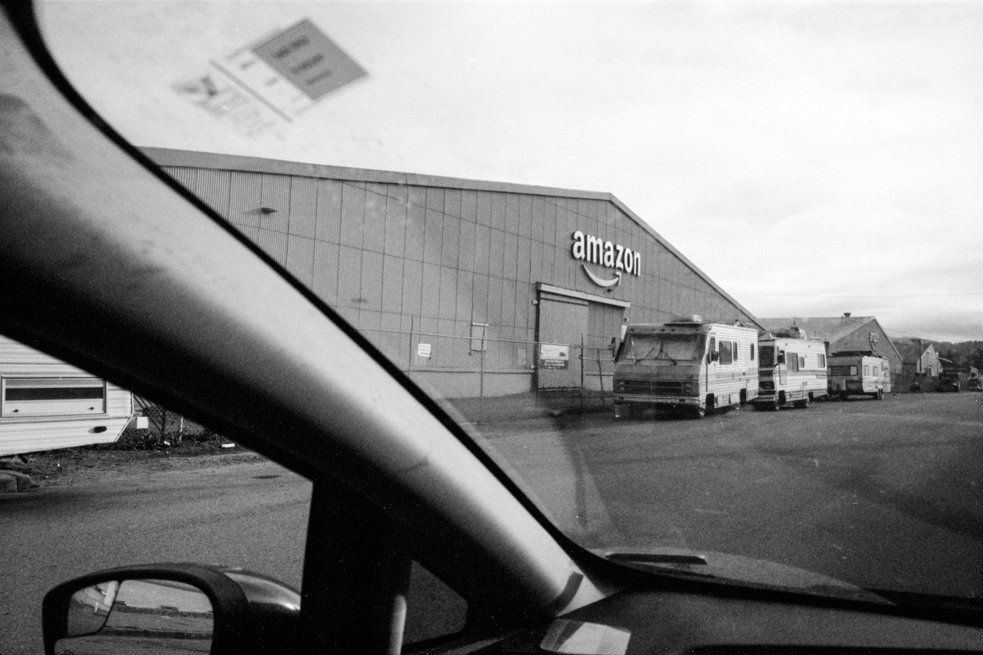 Along Jerrold and Barneveld avenues, rows of RVs sit wheel-to-wheel. Children’s bikes and barbecue grills rest outside. On Toland Street, a massive Amazon logo looms over the rows of vehicular homes.