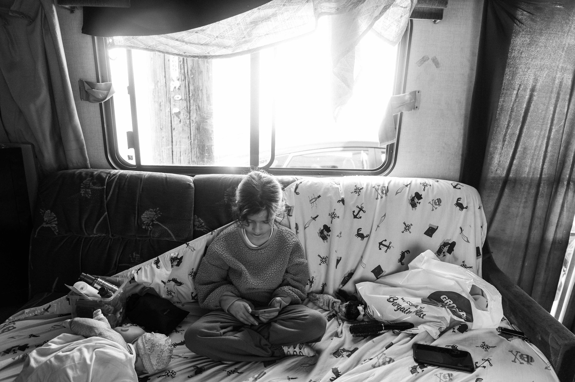 Sofía, 7, plays on a smartphone inside the RV her parents rent for $1,000 a month in the industrial Bayview neighborhood in San Francisco, California, on April 3, 2025. (Pablo Unzueta for El Tecolote/CatchLight Local)