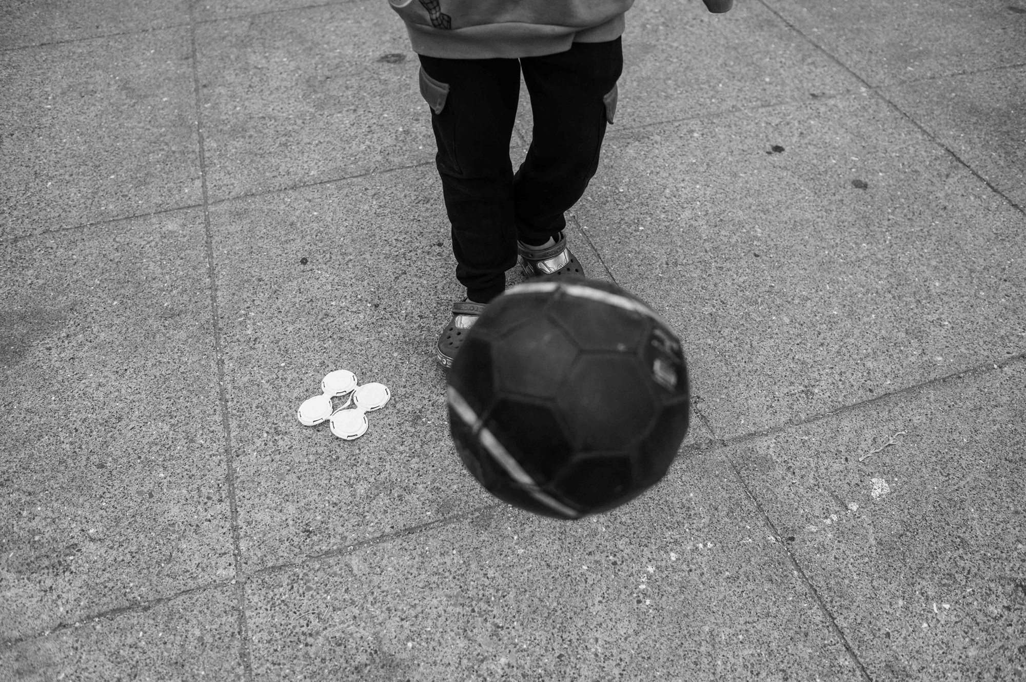 Samir, 8, tries to juggle his soccer ball with his feet in the Bayview neighborhood in San Francisco, California, on April 24, 2025. (Pablo Unzueta for El Tecolote/CatchLight Local)
