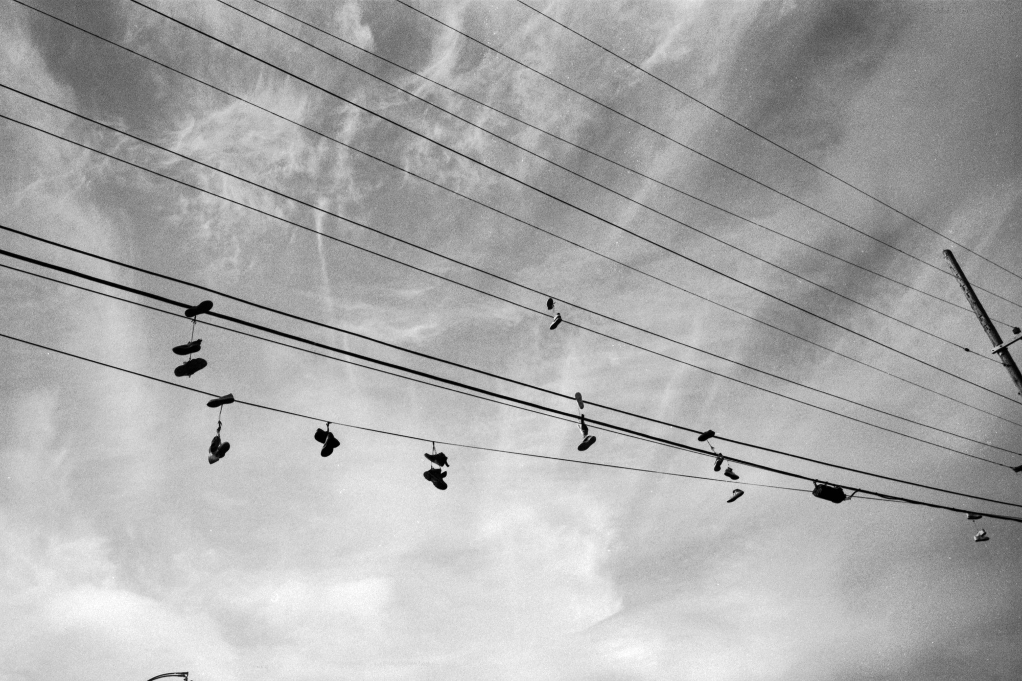 Pairs of shoes dangle above the Bayview neighborhood where a concentration of families are living inside their RVs, many who are working immigrants, in San Francisco, California, on Jan. 17, 2025. (Pablo Unzueta for El Tecolote/CatchLight Local)