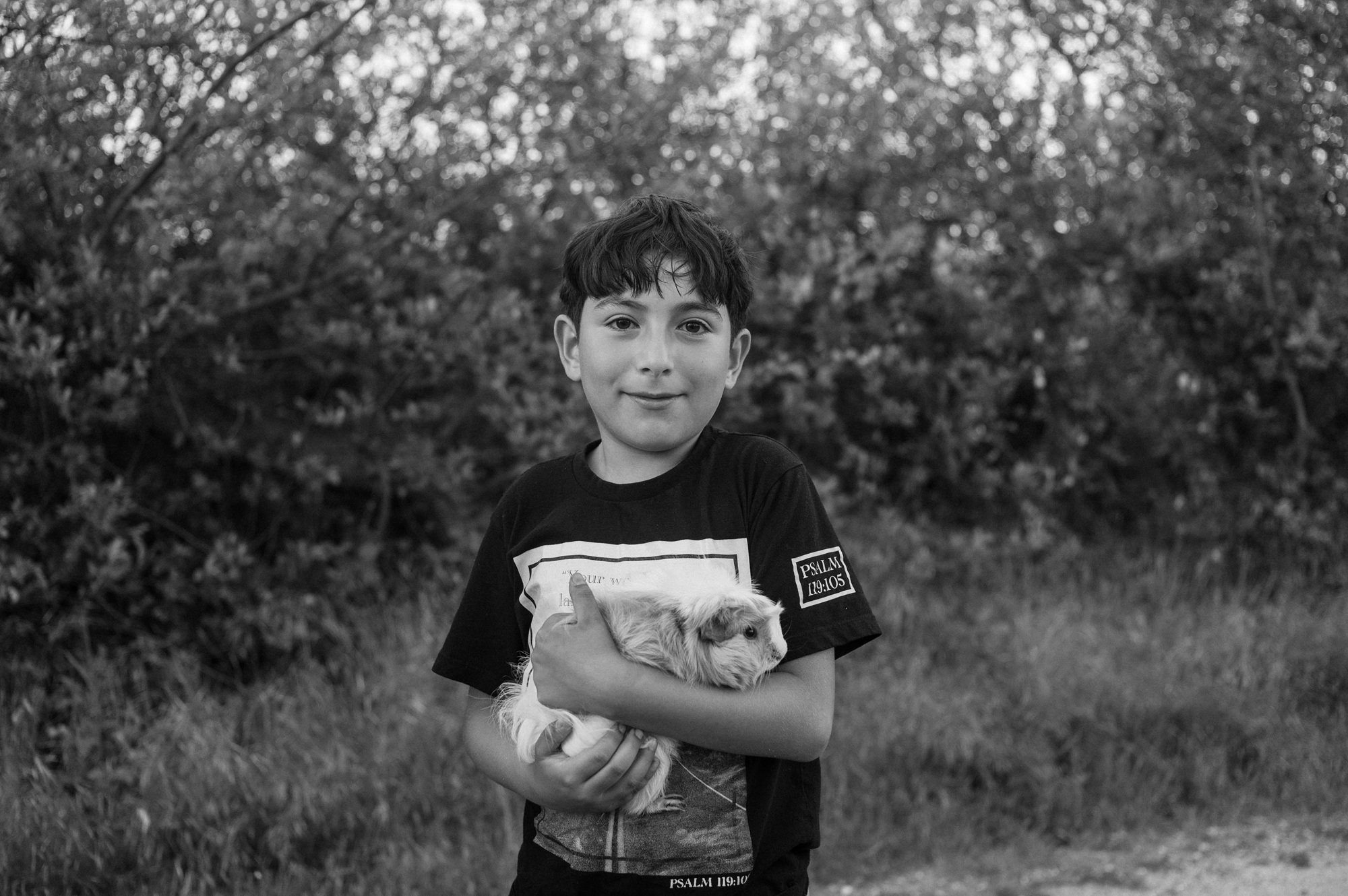 Nathan, 8, holds his guinea pig outside the RV he shares with his mother, Jessica Cuevas, near Lake Merced in San Francisco, California, on April 9, 2025. (Pablo Unzueta for El Tecolote/CatchLight Local)