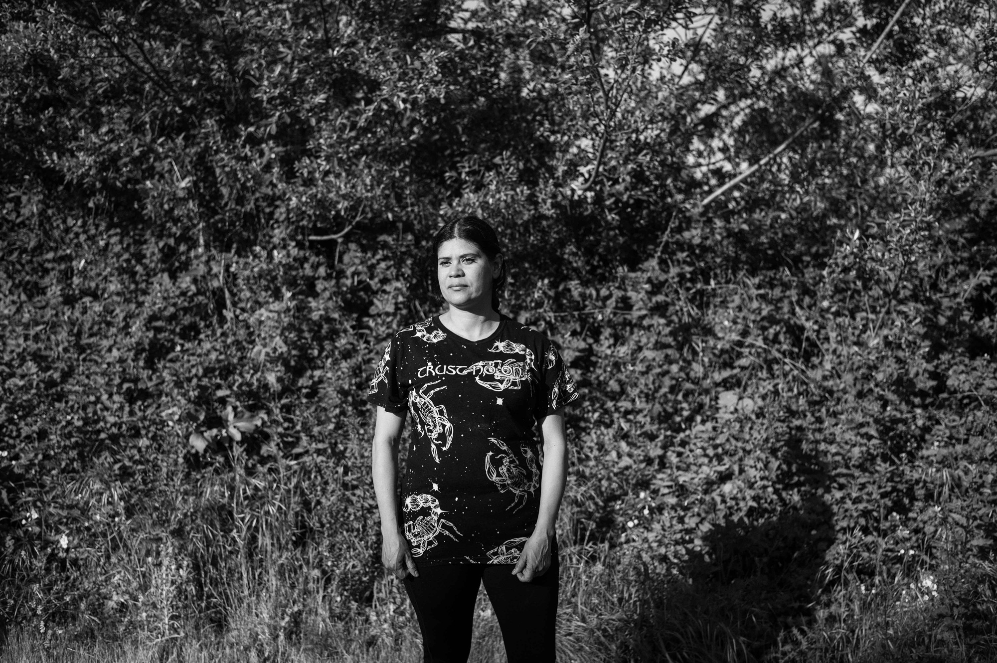 Yuri S., 40, stands outside her RV near Lake Merced, an area that has become a parking refuge for working families in San Francisco, California, on April 9, 2025. (Pablo Unzueta for El Tecolote/CatchLight Local)
