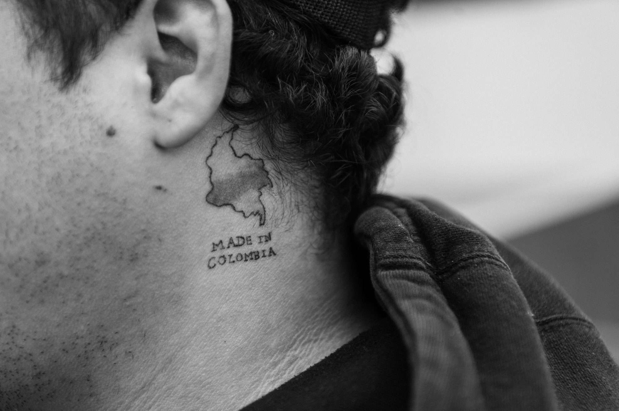 Juan Sebastián, 25, a newcomer from Colombia, shows his neck tattoo in the Bayview neighborhood of San Francisco, California, on April 24, 2025. “I carried my two daughters in front of me with my suitcase on my back,” Sebastián said, recalling his migration through the Darién Gap from Colombia. He and his wife later saved enough money to apply for political asylum and obtain Social Security numbers. “It’s all been thanks to the RV,” he said. (Pablo Unzueta for El Tecolote/CatchLight Local)