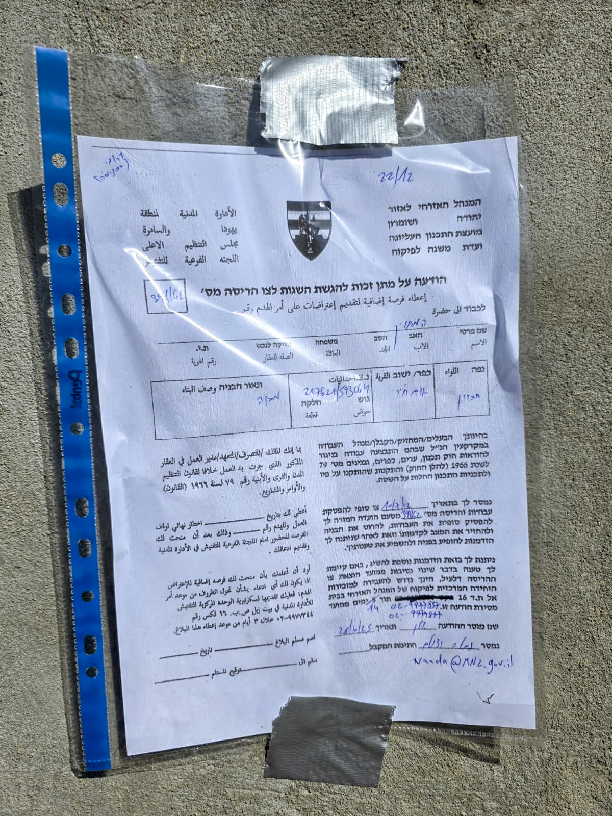 Residents took photos of the alleged demolition orders and stop-work order, delivered by Israeli Civil Administration employees and Israeli soldiers, on Oct. 28, 2025. (Courtesy of residents of Umm al-Khair)