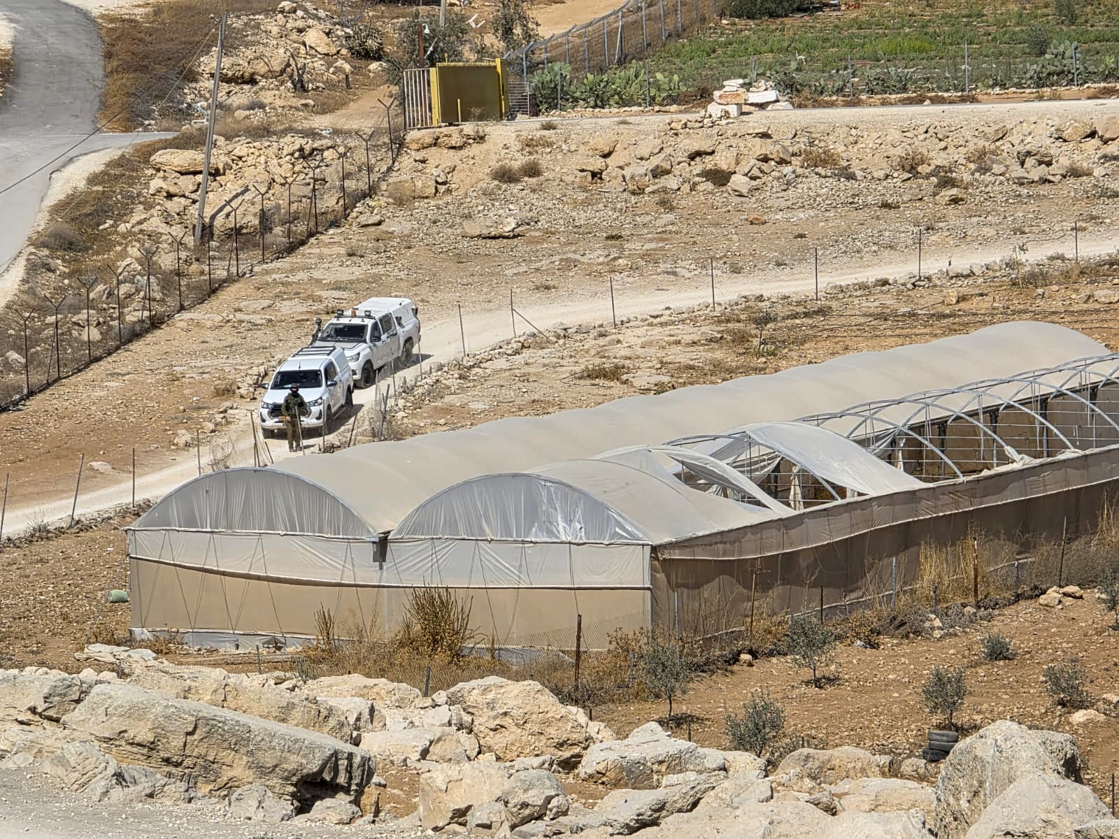 Israeli army personnel delivered demolition orders on Tuesday, Oct. 28, 2025, for more than a dozen structures in Umm al-Khair, including a greenhouse that activists said was essential for sustaining the village. (Courtesy of Umm al-Khair residents)