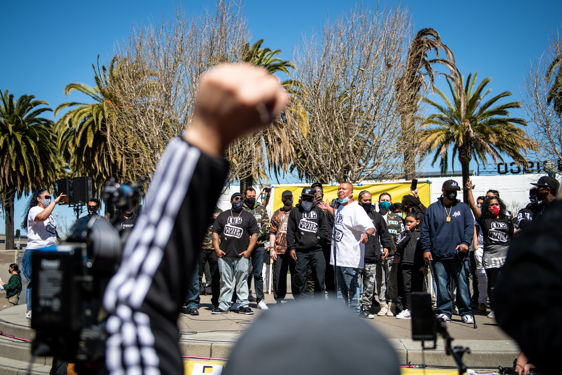 Members of the United Playaz speak during a student-led rally to show solidarity with Asian Americans at the Embarcadero Plaza in San Francisco on March 26, 2021. (Beth LaBerge/KQED)