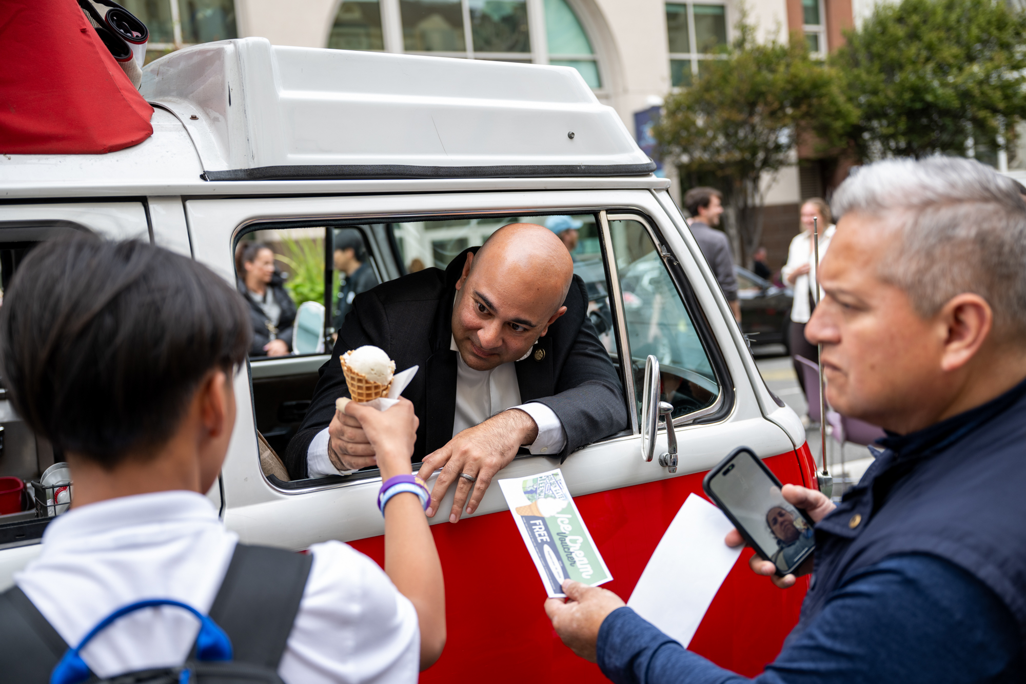 Supervisor Bilal Mahmood gives away ice cream at the inaugural children’s ice cream social in the Tenderloin in San Francisco on Sept. 18, 2025. (Beth LaBerge/KQED)