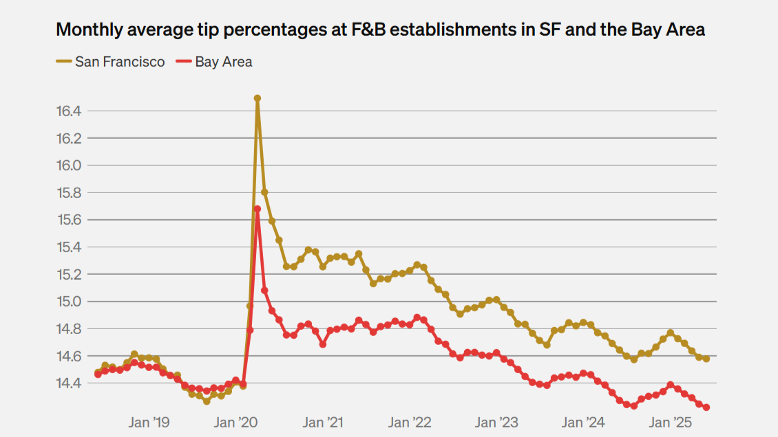 But after that peak, F&B tipping has slowly decreased. Data from Square shows that the monthly average for the Bay Area in June 2025 was 14.22% — lower than it was at any time in 2019. Nationally, tipping across all F&B establishments has not grown in the past year.