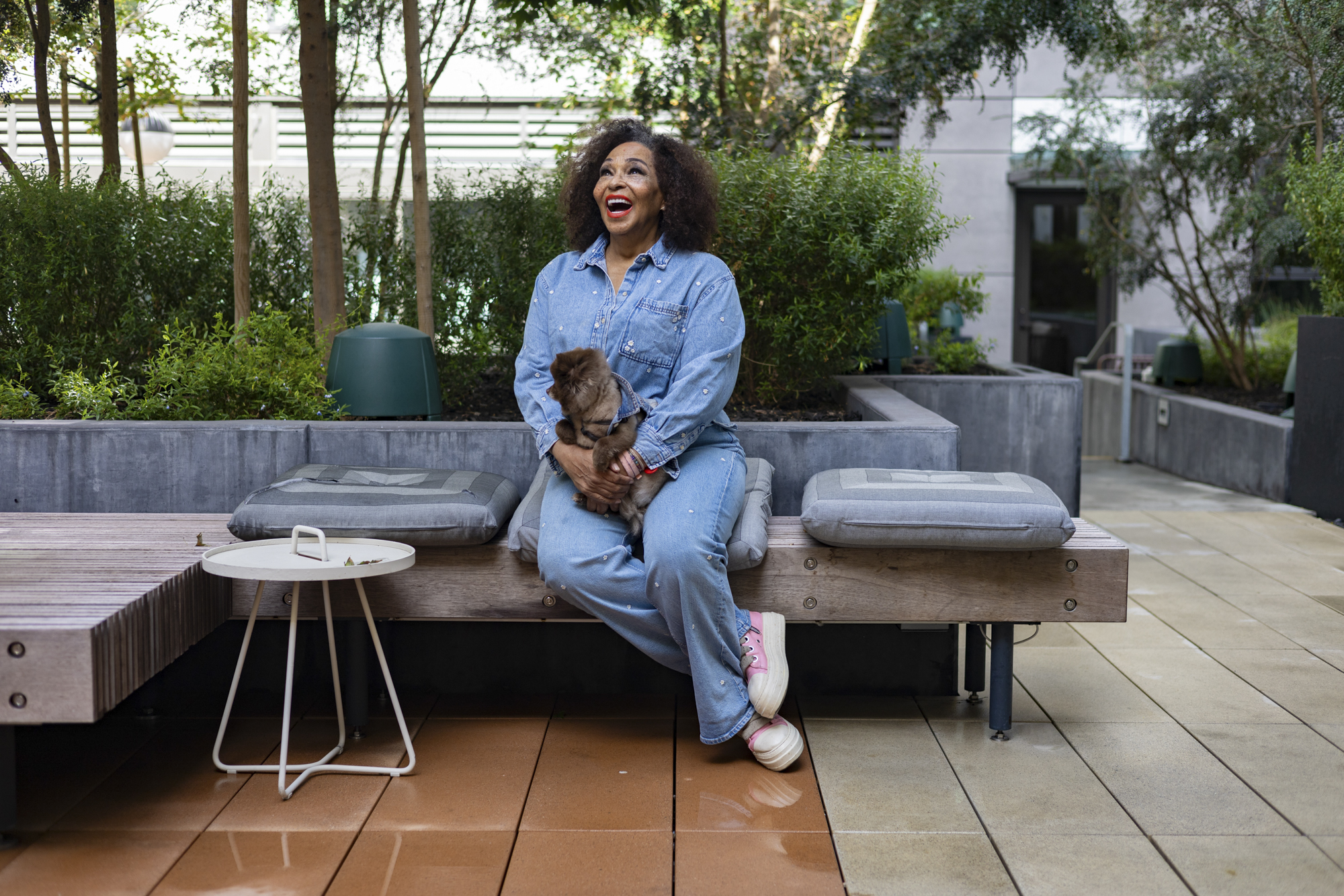 Andrea Horne, a performer, historian and activist poses for a photo with her 4-year-old Pomeranian Mei-Mei, outside of her home in San Francisco on Nov. 7, 2025. (Gina Castro for KQED)