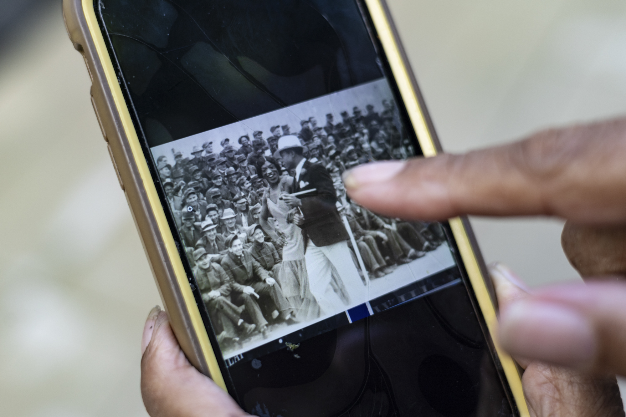 Andrea Horne shows a photo of a Black trans woman named Kate, parading in front of a group of San Quentin prisoners in 1925, on her phone in San Francisco on Nov. 7, 2025. (Gina Castro for KQED)