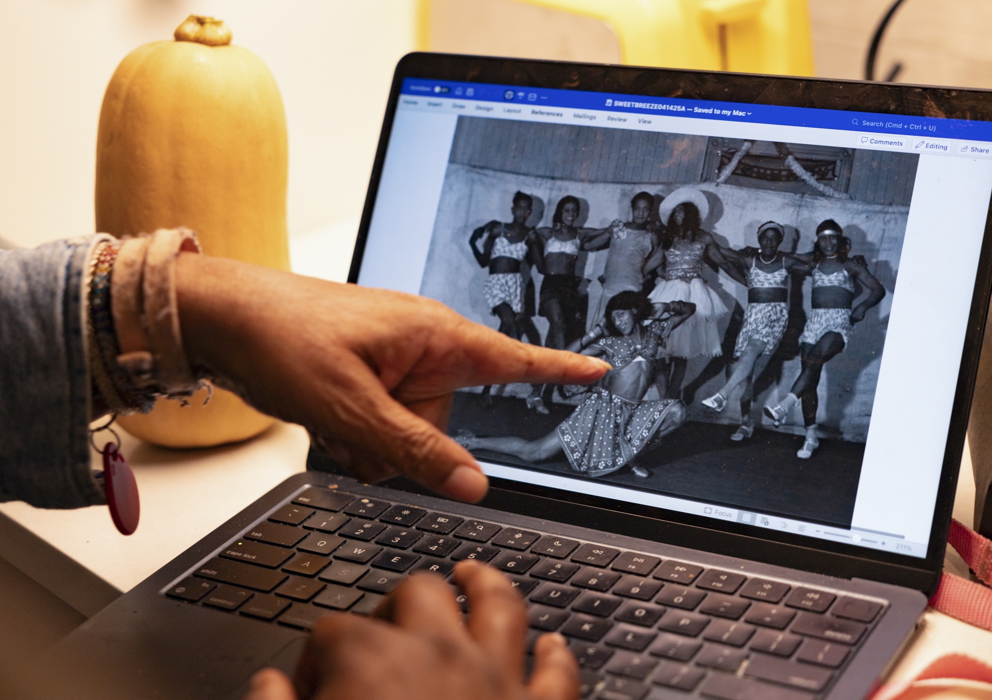 Andrea Horne points to a photo of Sweet Evening Breeze, center, a Black trans woman born in 1982, on her laptop at her home in San Francisco on Nov. 7, 2025. Andrea is working on a book called “How Black Trans Women Changed the World.” (Gina Castro for KQED)