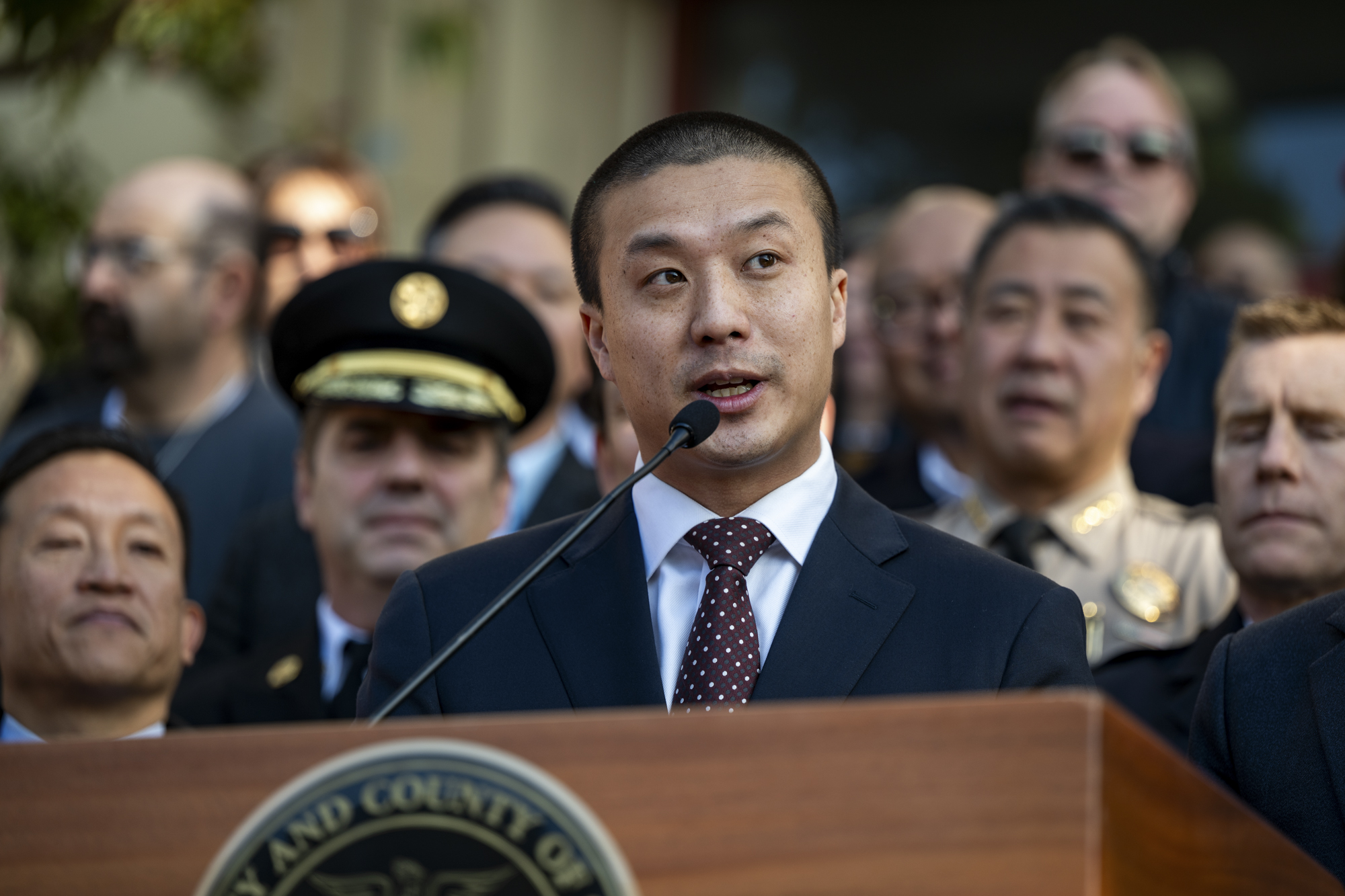 At his swearing-in ceremony, Wong stressed the importance of public safety as he stood flanked by the city’s top brass, including the chief of police and fire chief, as well as members of the military and two of the city’s moderate Democratic supervisors.
