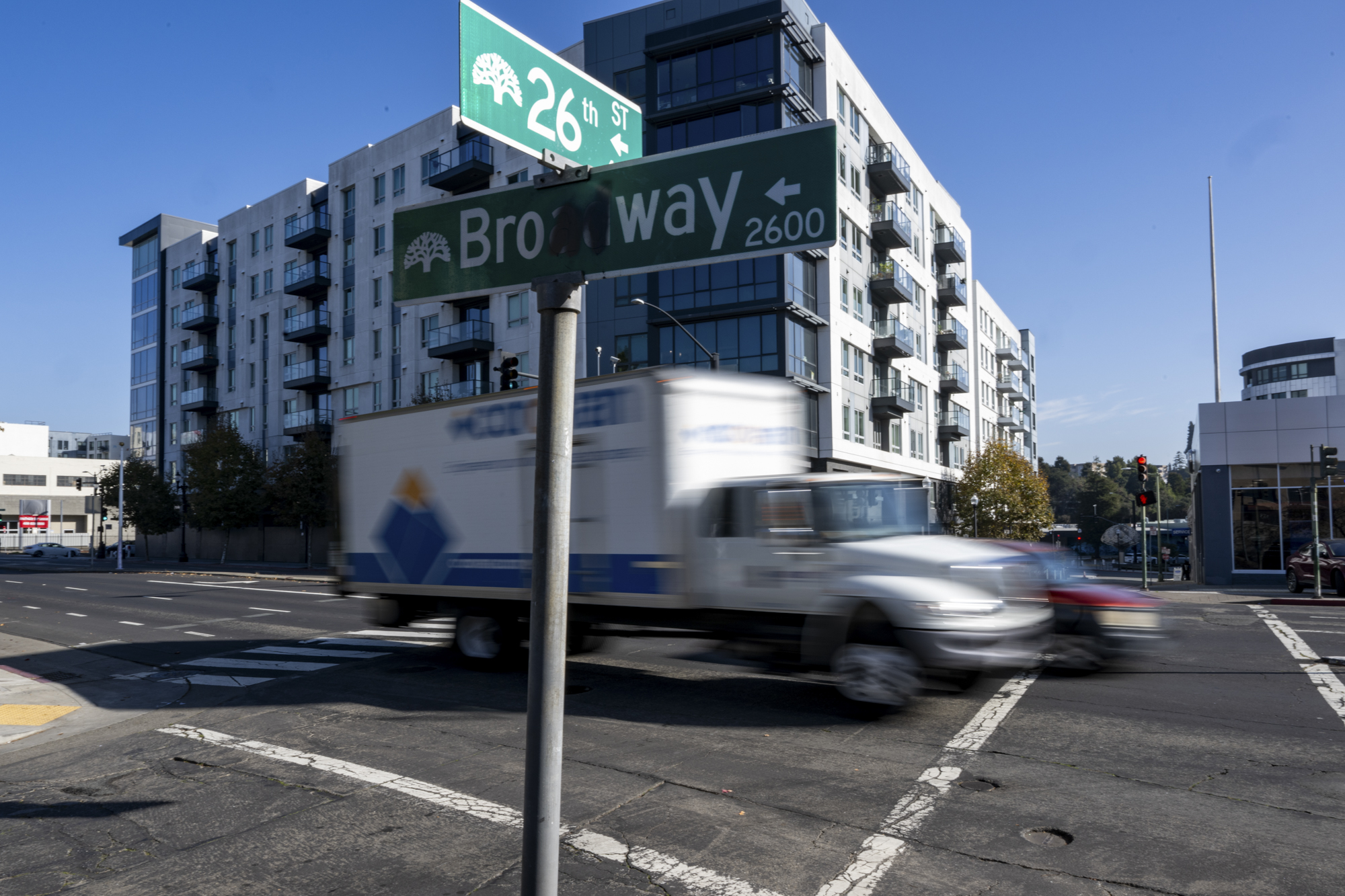 Vehicles drive through the intersection of Broadway and 26th Street in Oakland on Dec. 2, 2025, where a speed-camera pilot program will install a camera on Broadway between 26th and 27th streets. (Beth LaBerge/KQED)