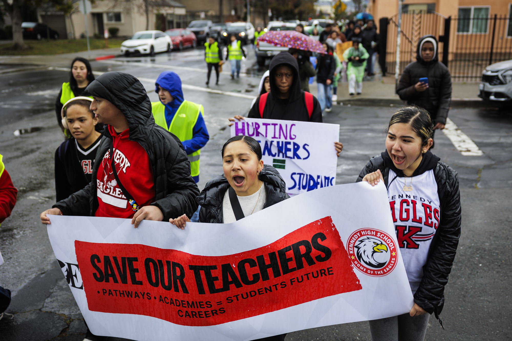 Valerie Aquino (center) and other students from Richmond’s John F. Kennedy High School stage a walkout and march to the West Contra Costa Unified School District Offices to protest impending layoffs as part of cuts to the district’s budget in Richmond on March 12, 2025. (Martin do Nascimento/KQED)