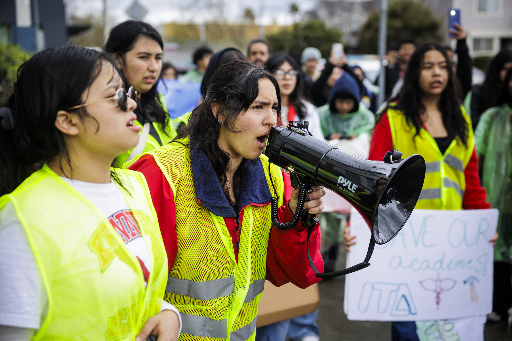 Julissa Blandon and other students from Richmond’s John F. Kennedy High School stage a walkout and rally in front of to the West Contra Costa Unified School District Offices to protest impending layoffs as part of cuts to the district’s budget in Richmond on March 12, 2025. (Martin do Nascimento/KQED)