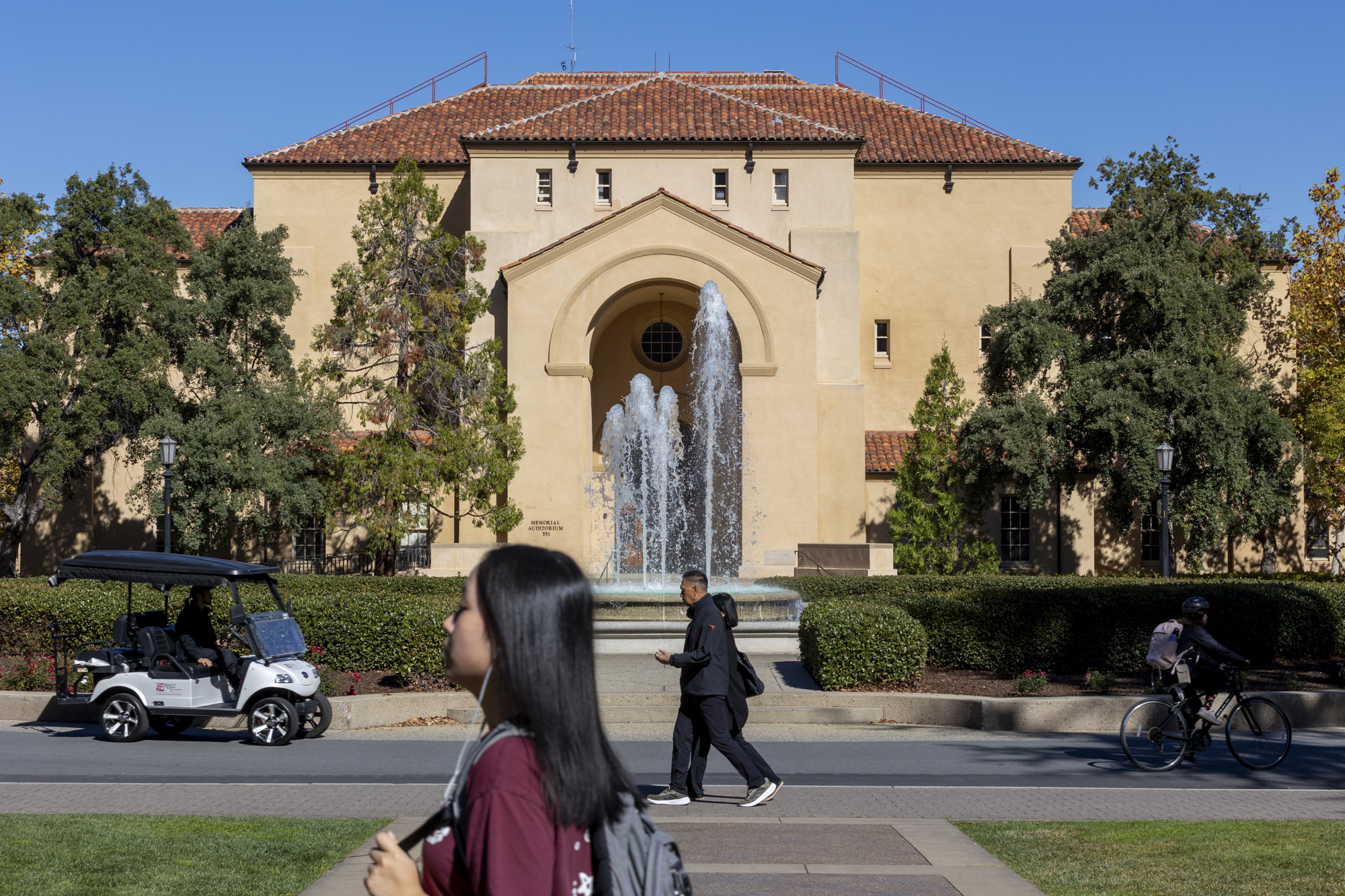 Students walk and bike past the fountain outside Memorial Auditorium at Stanford University in Stanford on Oct. 29, 2025. (Gustavo Hernandez/KQED)