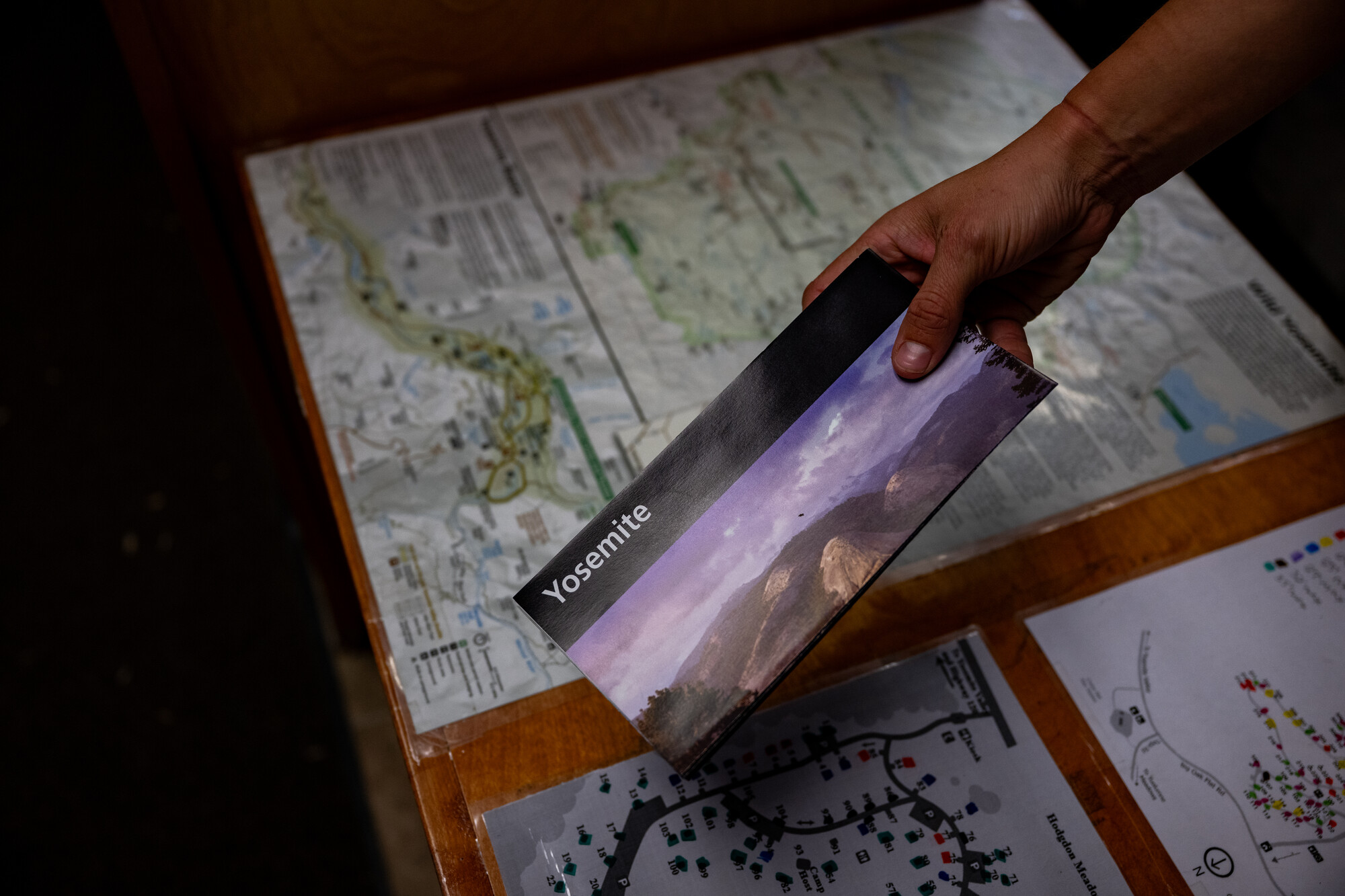 A park ranger holds a map at the entrance to Yosemite National Park in the Sierra Nevada Mountains on Oct. 28, 2025. (Beth LaBerge/KQED)