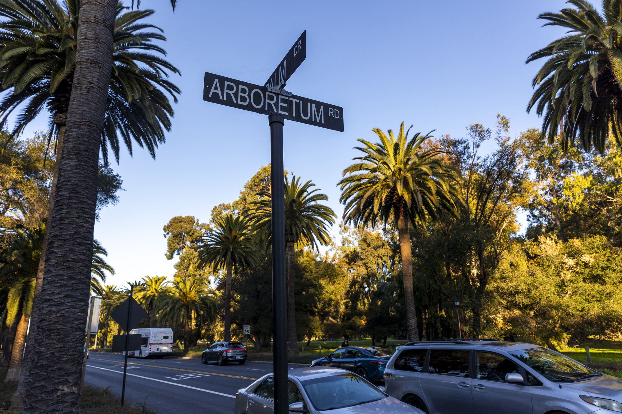 The intersection of Arboretum Road and Palm Drive, where 21-year-old Stanford sophomore Aradshar Chaddar was hit and killed in a bike collision this past summer at Stanford University in Palo Alto on Dec. 10, 2025. (Tâm Vũ/KQED)