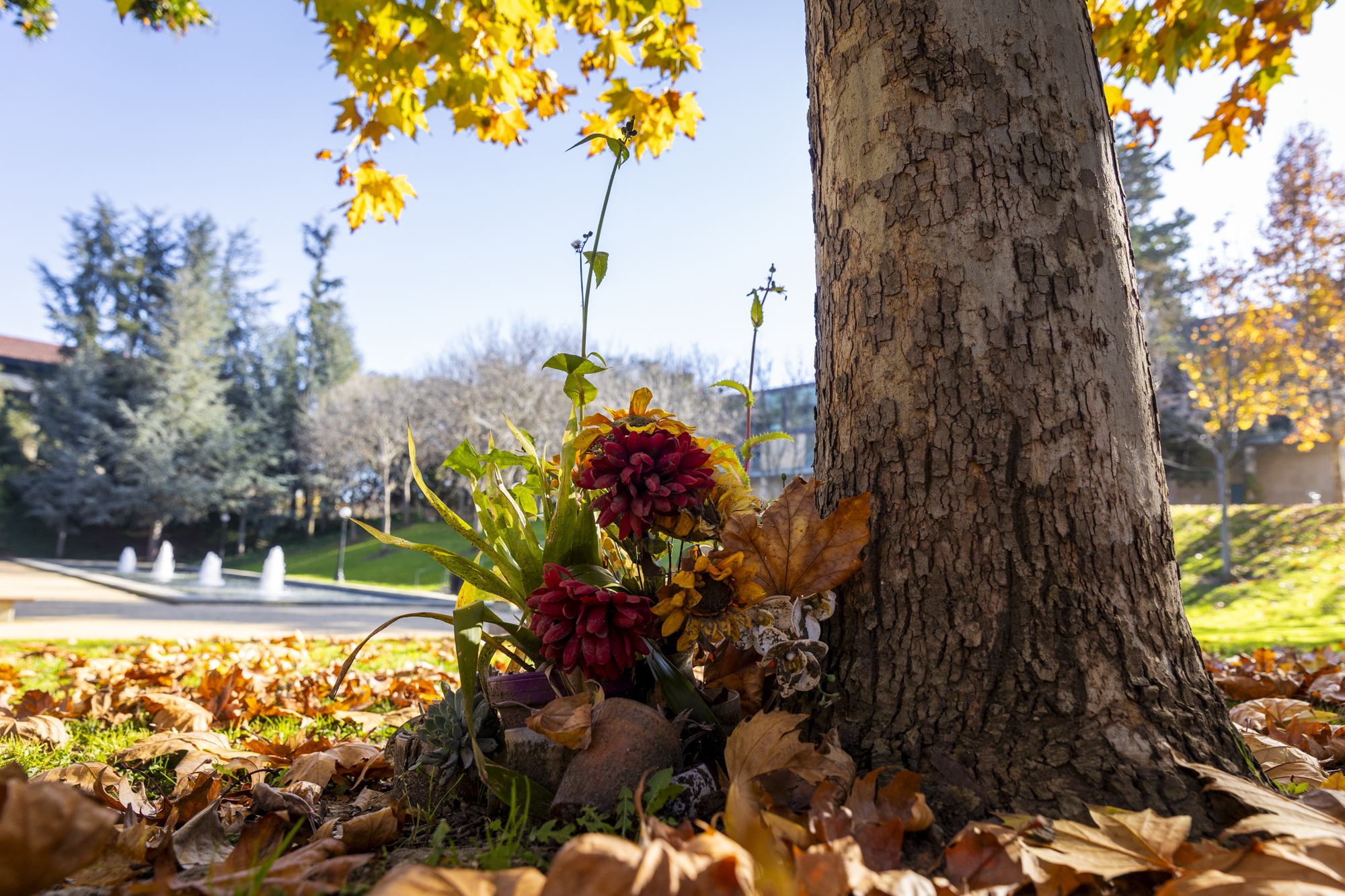 A vigil for 21-year-old Stanford sophomore Aradshar Chaddar, who was hit and killed in a bike collision this past summer, sits under a tree at Terman Fountain at Stanford University in Palo Alto on Dec. 10, 2025. (Tâm Vũ/KQED)