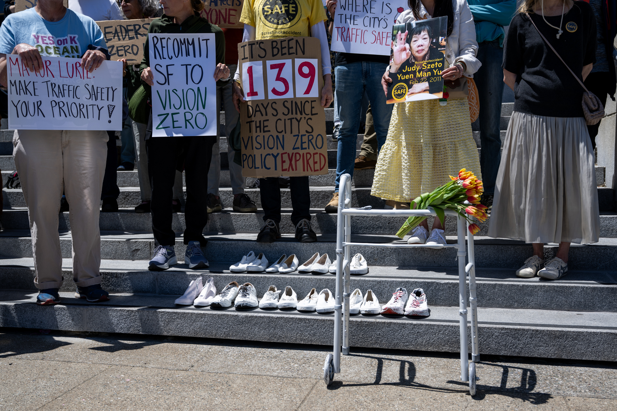 Traffic safety advocates from Walk San Francisco, Families for Safe Streets, and the Vision Zero Coalition gather on the steps of San Francisco City Hall on May 19, 2025, to demand the adoption of a new Vision Zero policy by July 30. The demonstrators placed white shoes on the steps, symbolizing the pedestrians who have lost their lives in traffic crashes. (Beth LaBerge/KQED)