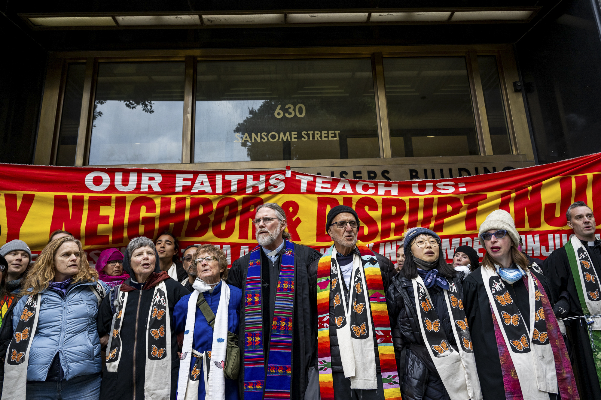 Faith leaders and immigrant advocates block the entrance to the ICE San Francisco field office on Dec. 16, 2025. (Beth LaBerge/KQED)